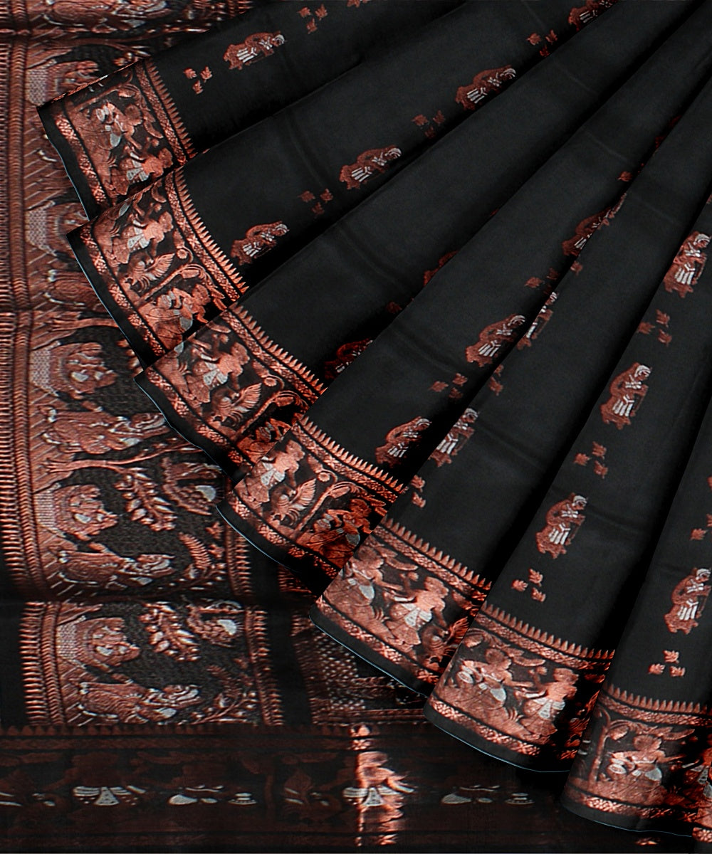 The Baluchari sari traces its origins to 500 years ago and in west Bengal. The name came into existence because the weaving of these sarees started in a small village called Baluchar in Murshidabad district of west Bengal. The word Baluchari itself means sandy river bank – referring that the village was on the banks of a river: in this case the Bhagirathi. Due to natural calamities, the weaving set up was moved to Bishnupur and grew tremendously during the british rule.