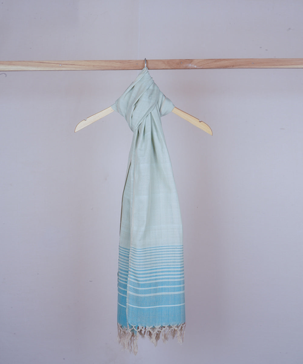 Beige blue cotton stole handwoven on the looms of Uttarakhand. Blue threads are woven horizontally in an ombré pattern adding a design on the edge of the stole. This reversible and versatile cotton stole with tassels is perfect to spruce up any outfit!