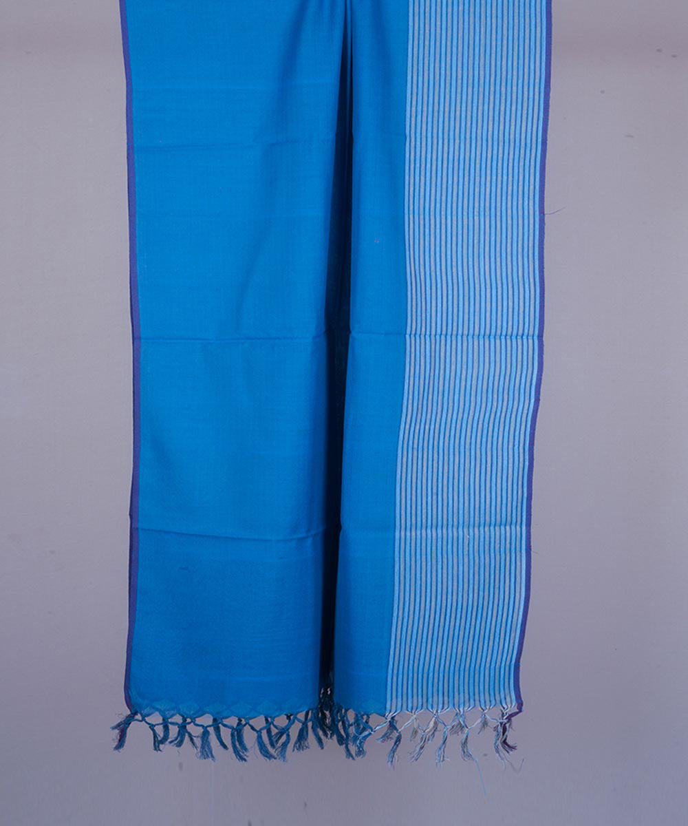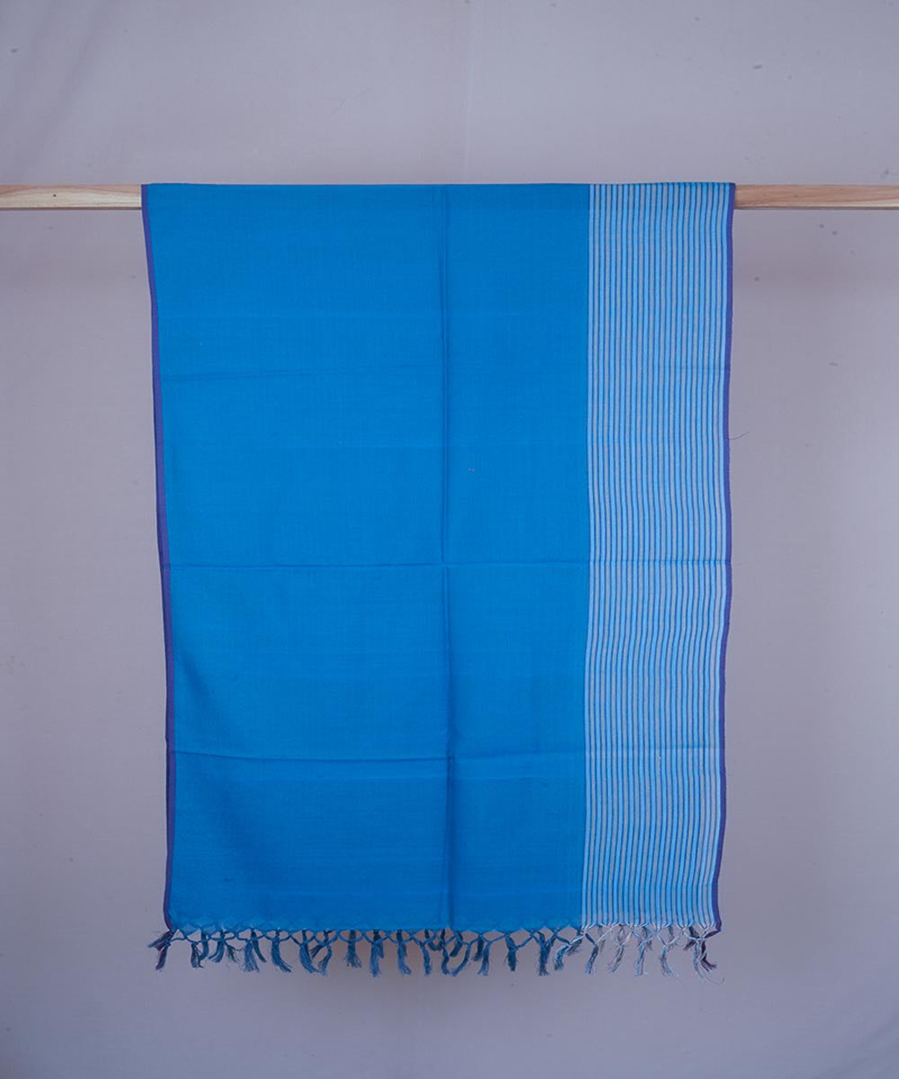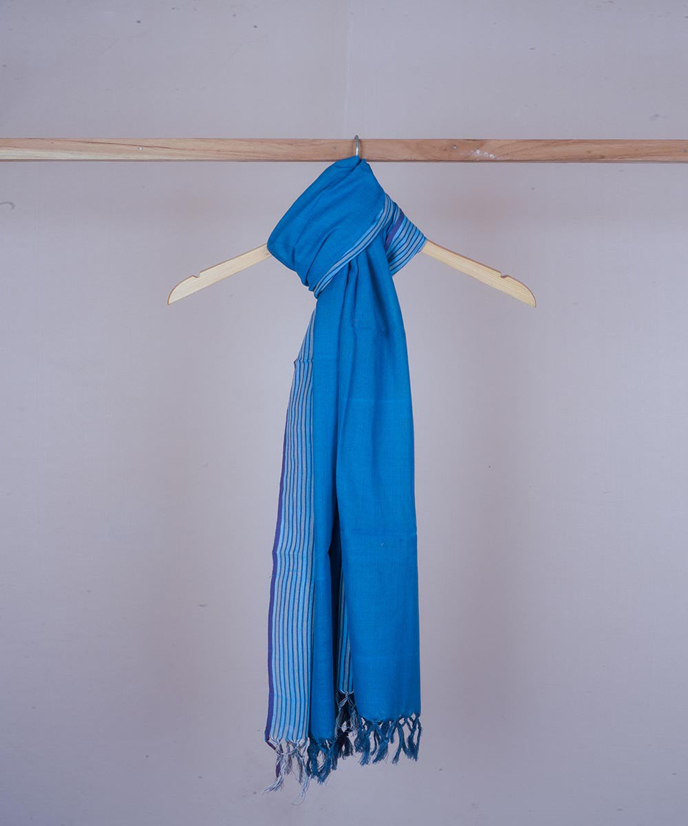 Blue cotton stole handwoven on the looms of Uttarakhand. Beige, blue and purple threads are woven on one side of the stole in a uniform stripes design highlighted with a purple border. This reversible and versatile cotton stole with tassels is perfect to spruce up any outfit!
