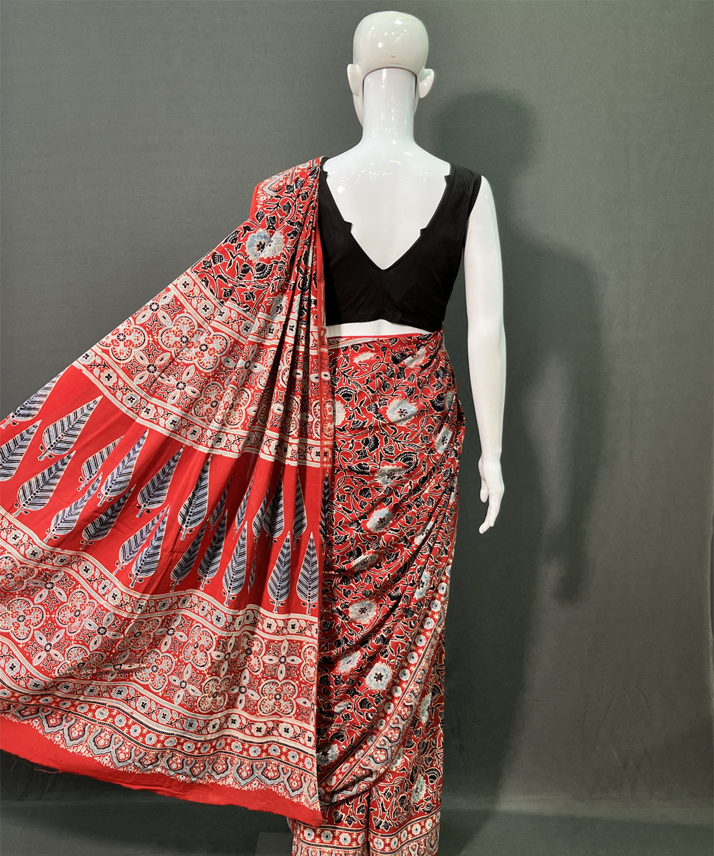 Maroon white ajrakh printed mul cotton saree