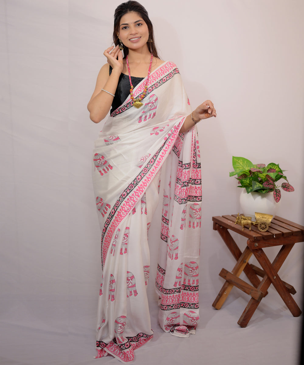 Offwhite pink hand block printed modal silk saree