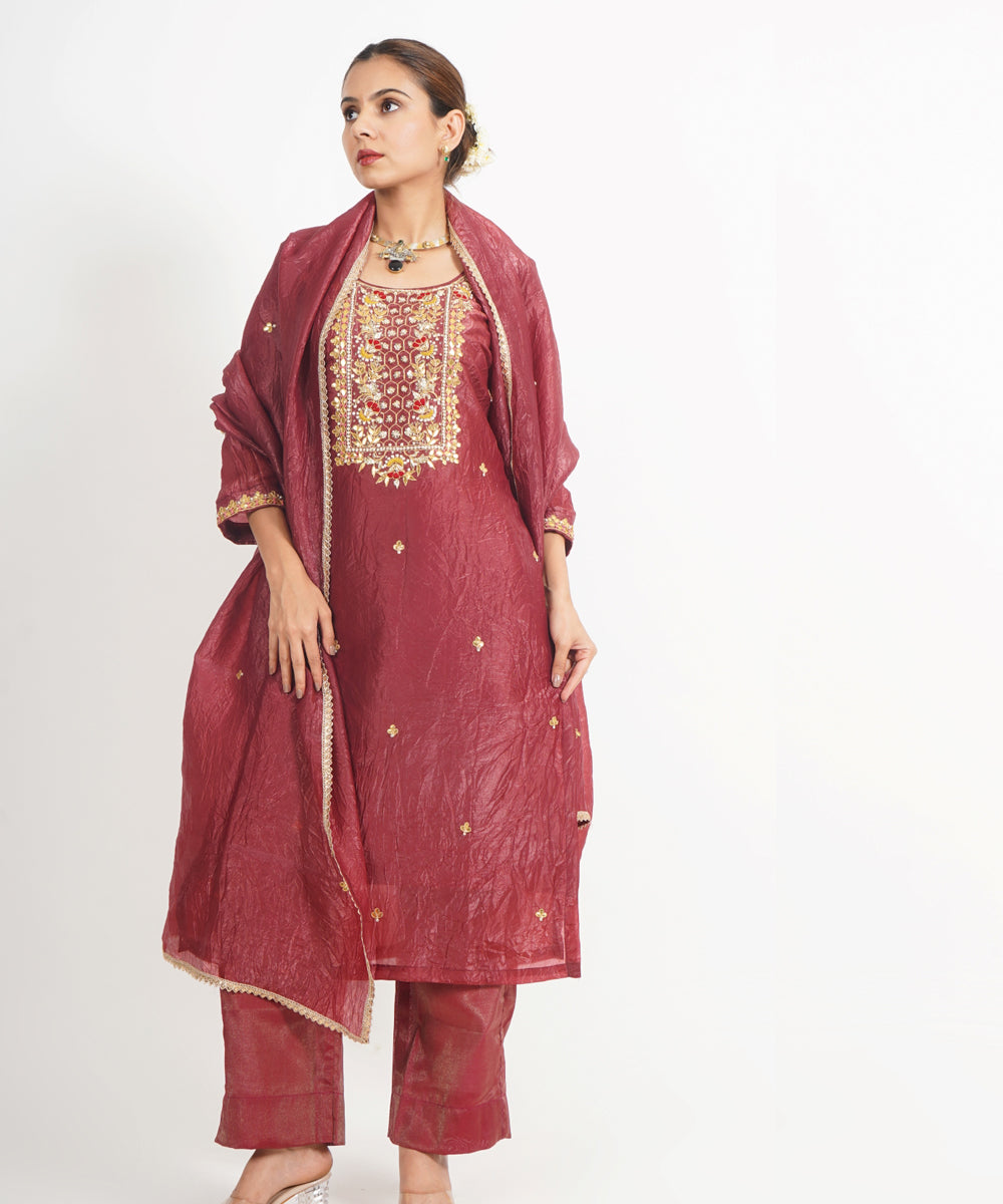 Chocolate maroon hawa mahal hand embroidered silk crepe womens suit- set of 3