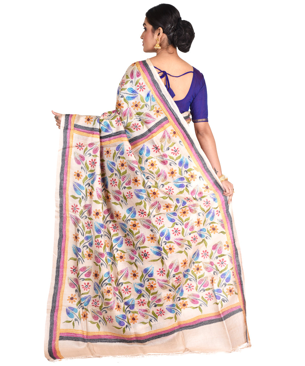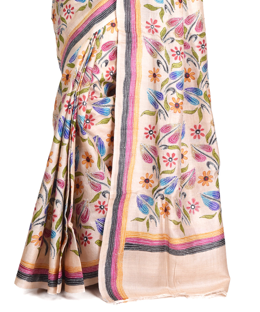 This handwoven Tussar Silk Saree has been woven in Hand spun Tussar in warp way and Hand spun Tussar in weft way and then Kantha Stitch done on it