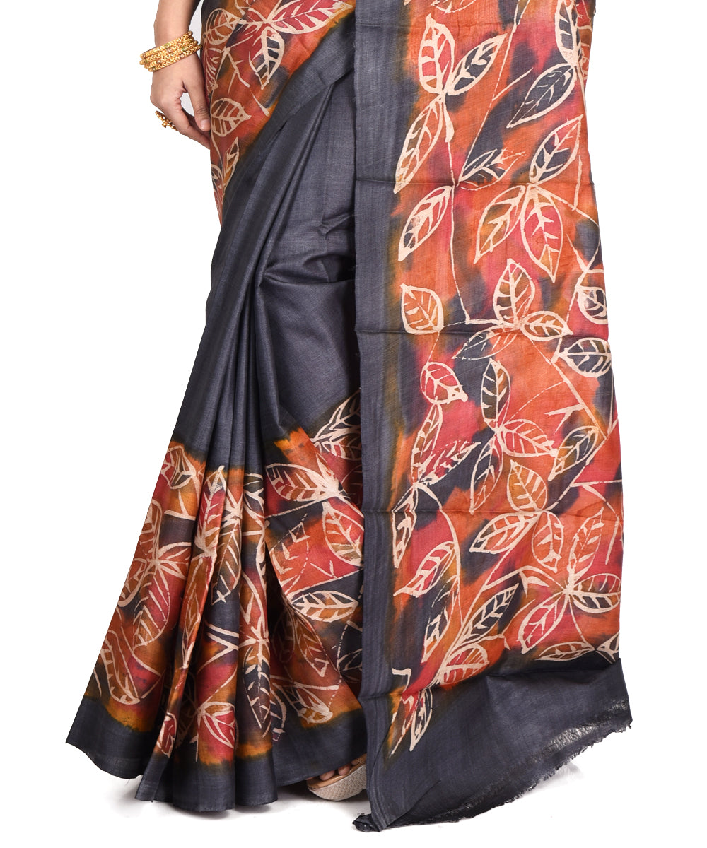 This saree has been woven in a thread count of 18/20 Denier Mulberry Silk in warp way and hand spun tussar silk in weft way and then Hand Batik work done on it.