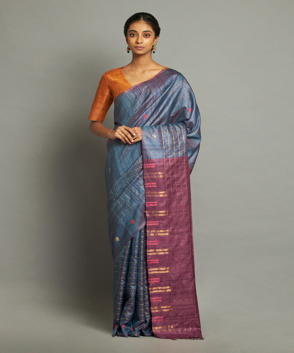 Deep blue tussar silk handwoven chhattisgarh kosa saree