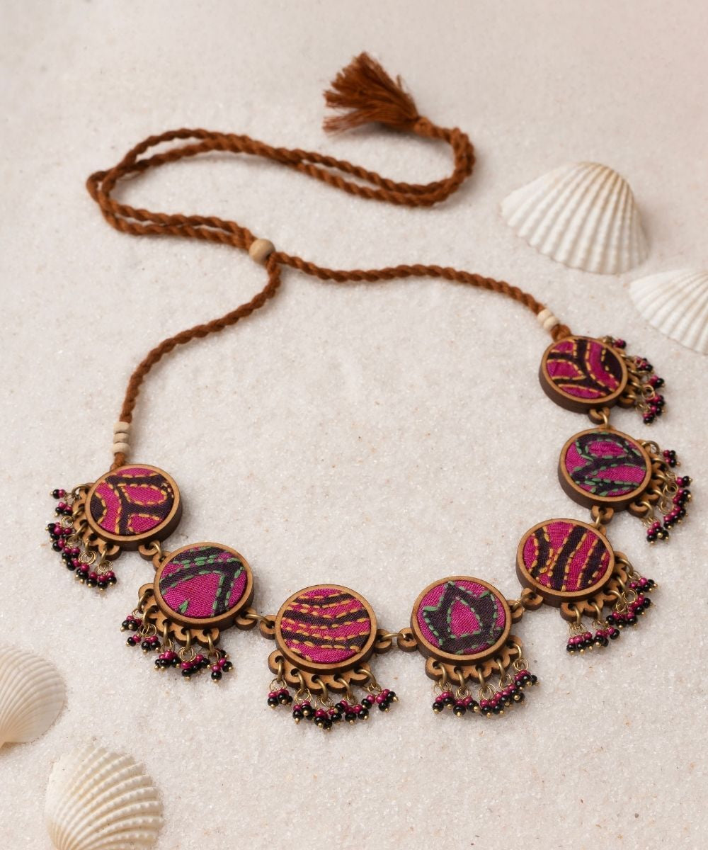 Multicolor kantha silk fabric and repurposed wood necklace