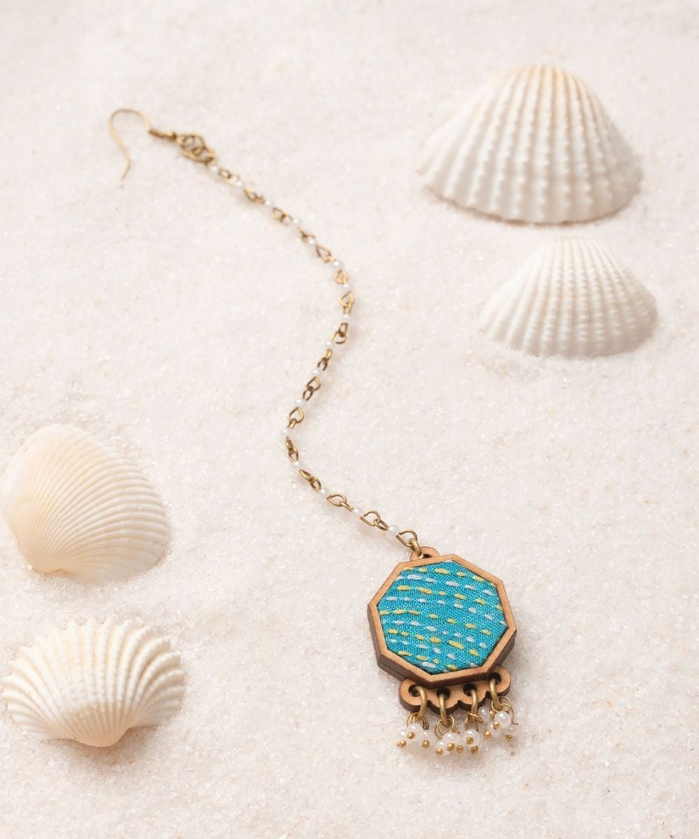 Turquoise kantha repurposed silk fabric and wood maang tika