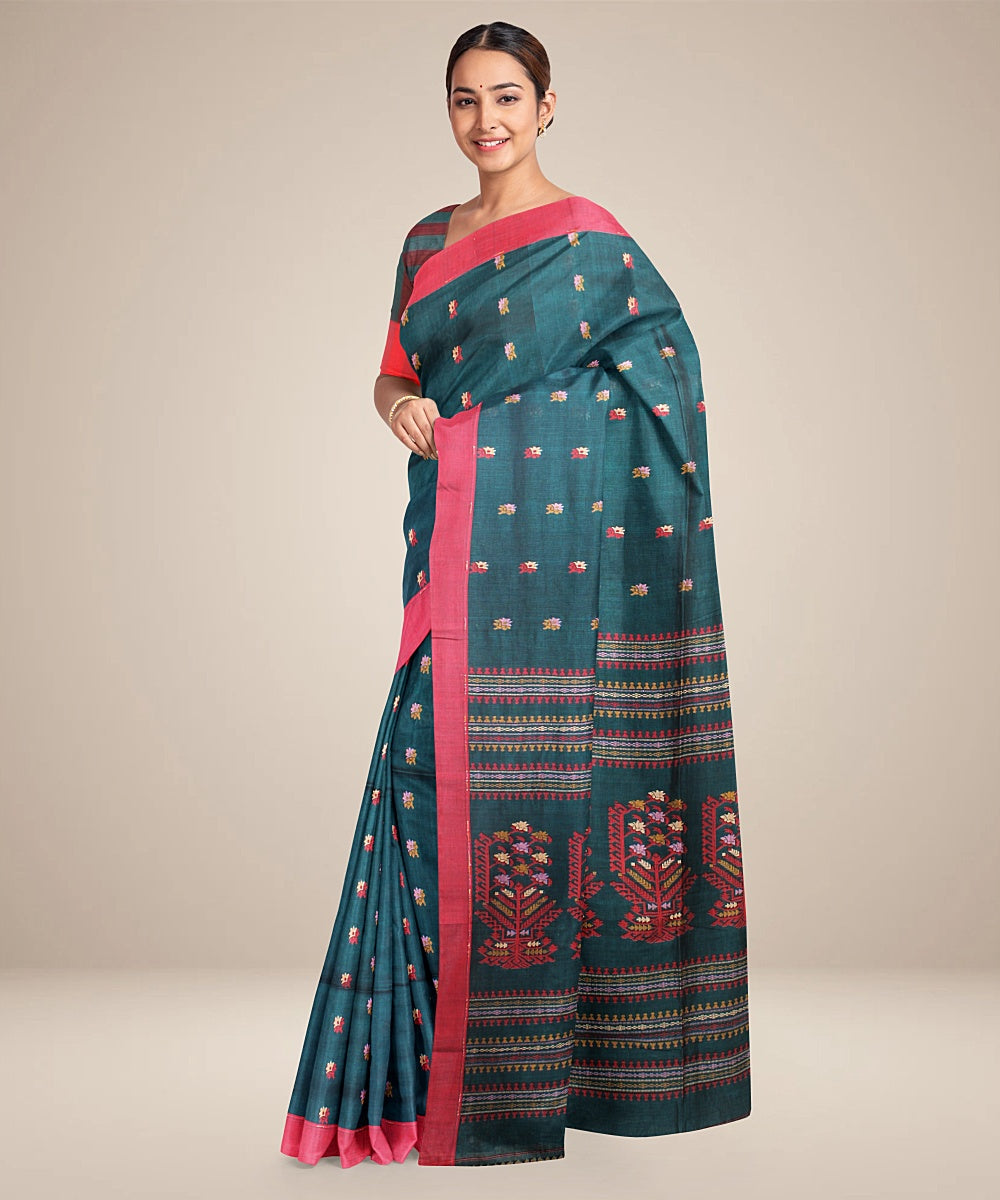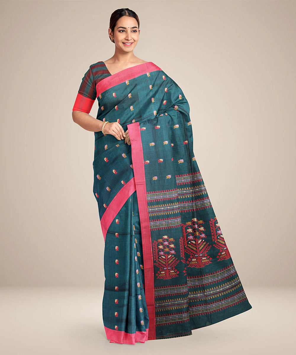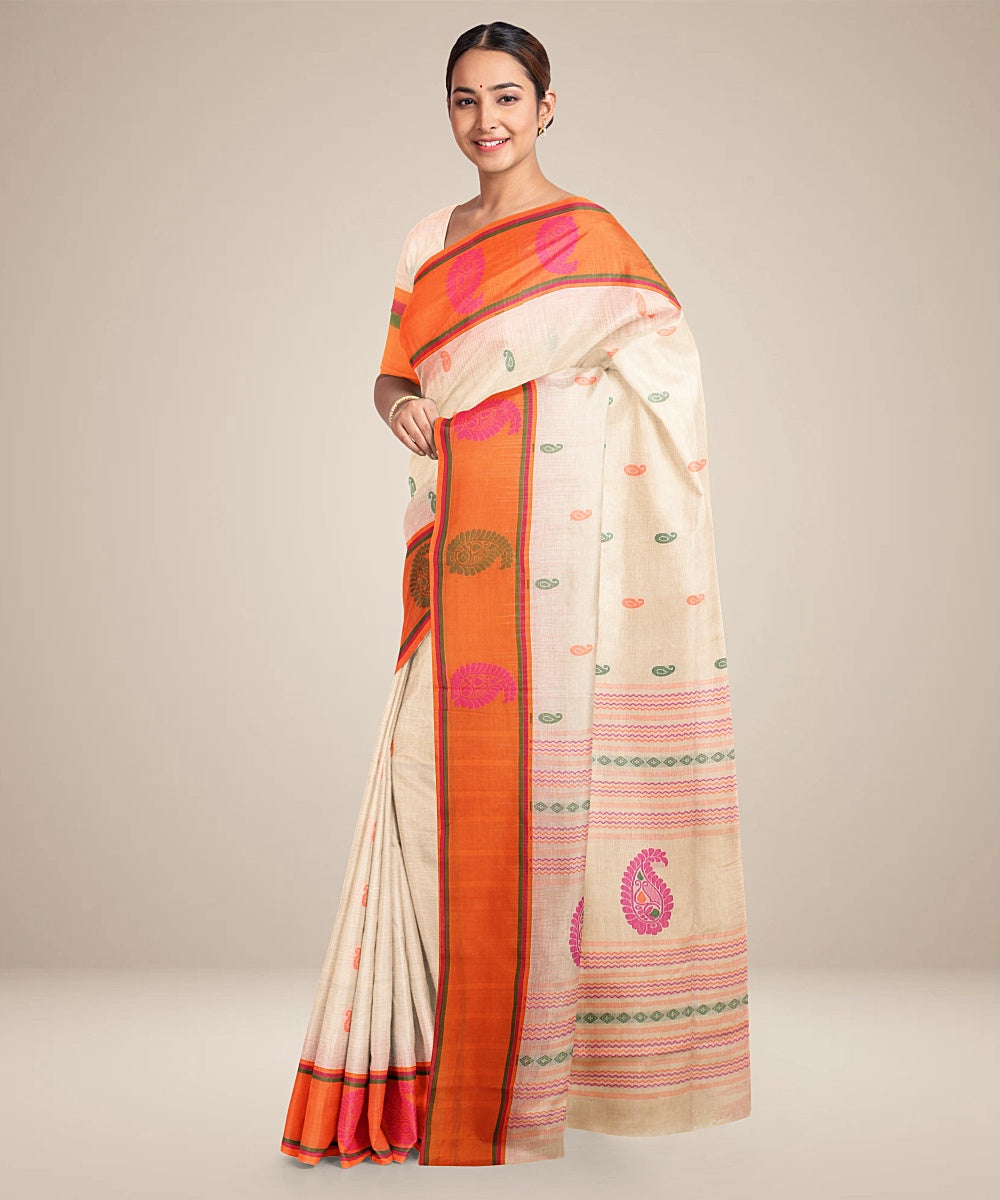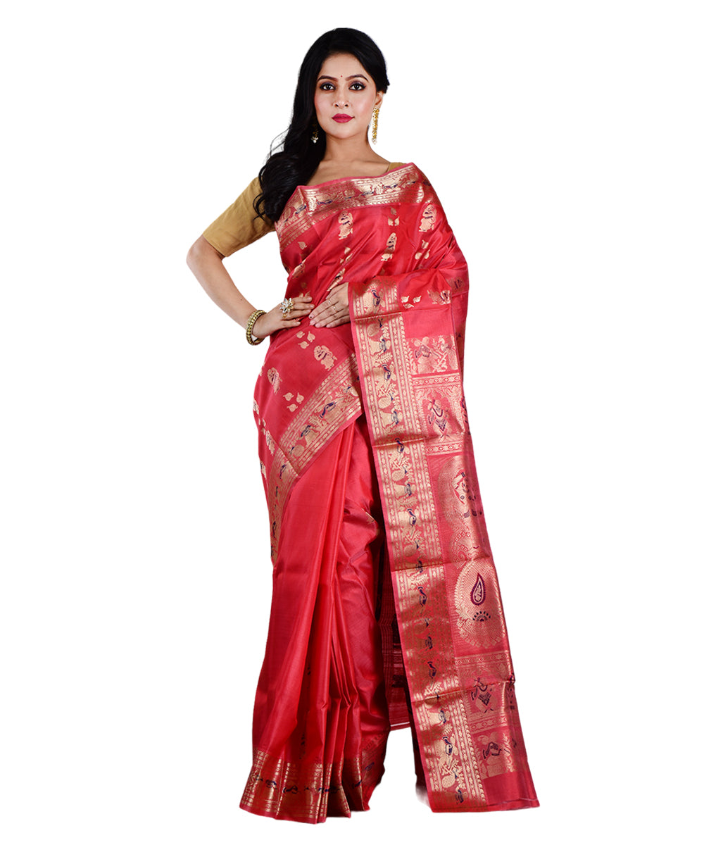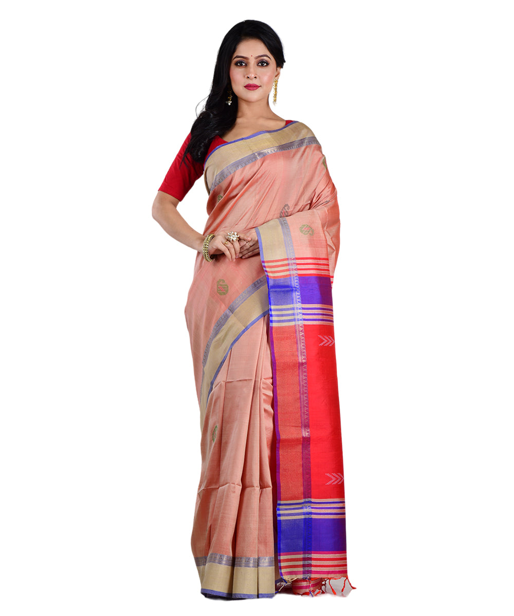 While synonymous with the reds and whites of Durga pooja, discover more of Bengal handloom varieties - Intricate jamdanis, skilled Kantha stitches, ancient baluchari weaves, simple cotton tants, explore more below.