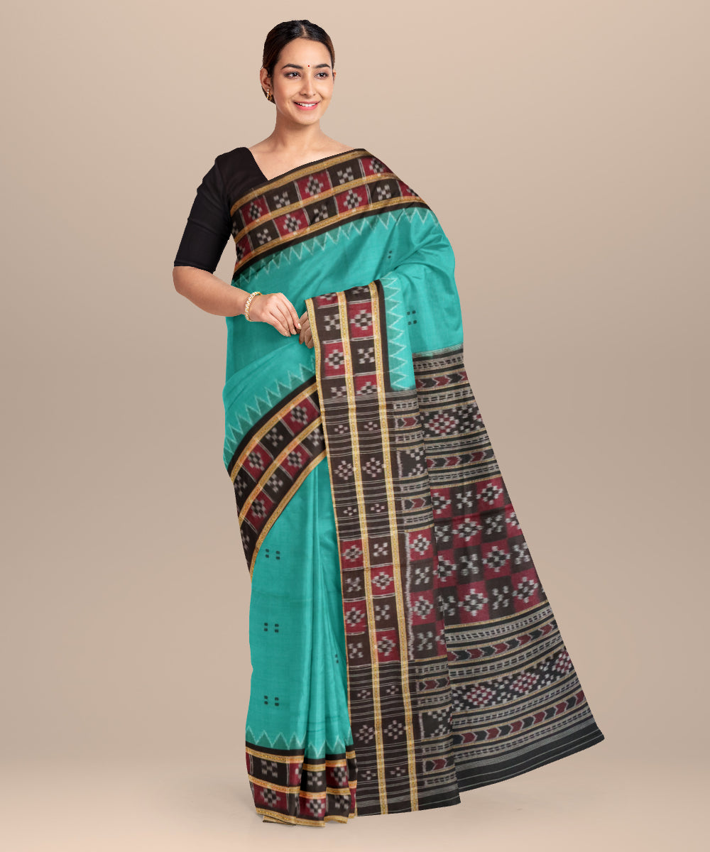 Deep green-cyan turquoise black cotton handloom nuapatna saree