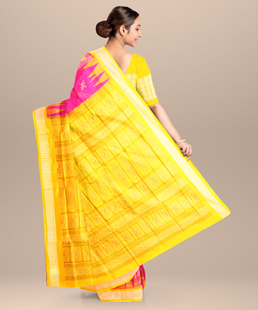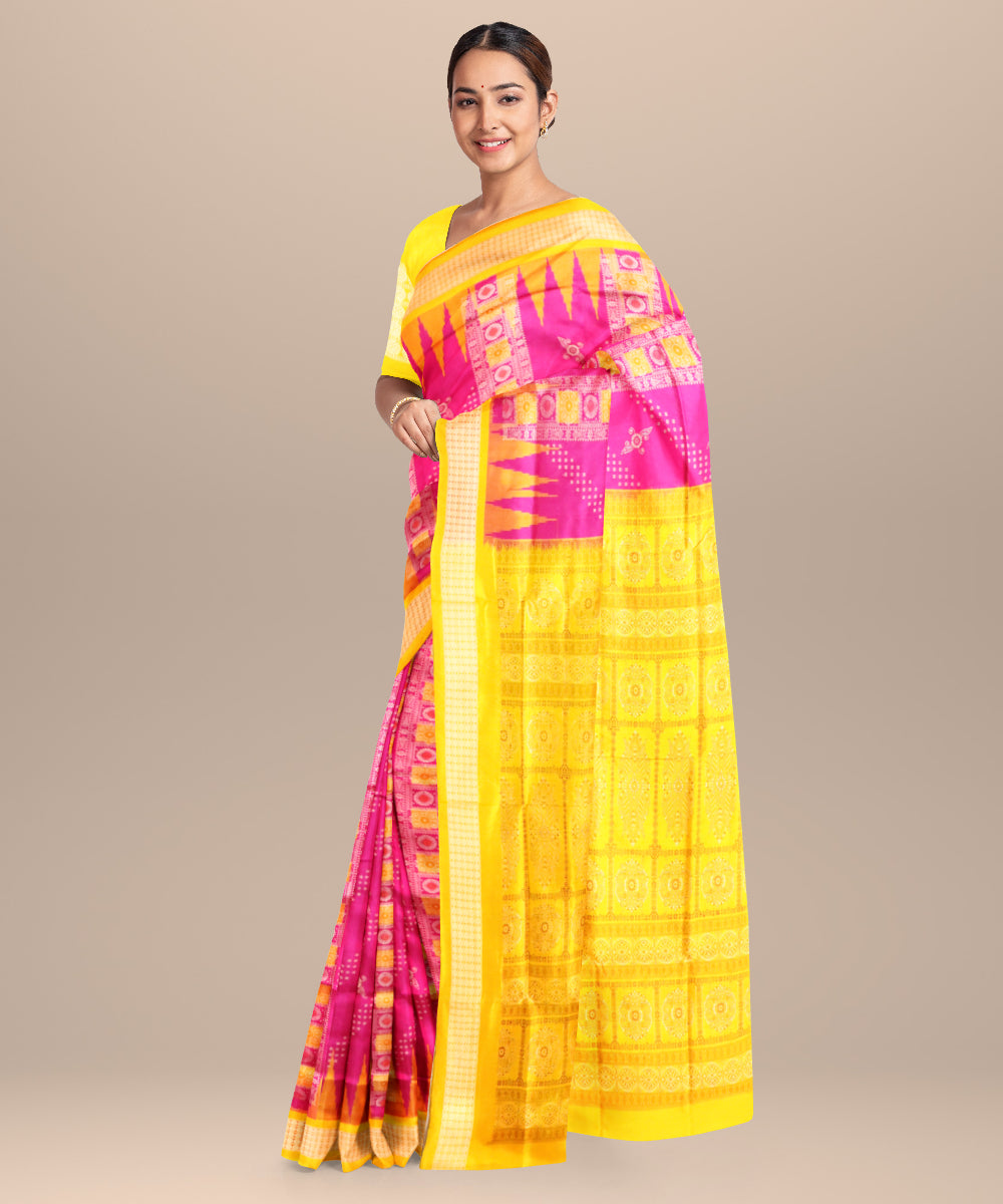 Fluorescent pink fluorescent orange silk handloom bomkai saree
