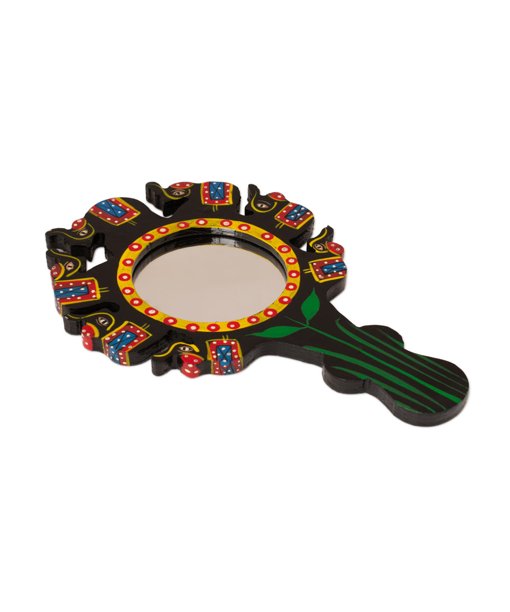 Add a touch of folk charm to your daily rituals with this hand-painted wooden handheld face mirror. Featuring a circular mirror surrounded by a playful parade of painted elephants, this vibrant piece doubles as a functional accessory and a piece of art. Lightweight and easy to carry, it’s perfect for makeup touch-ups, grooming, or as a unique vanity accent.
