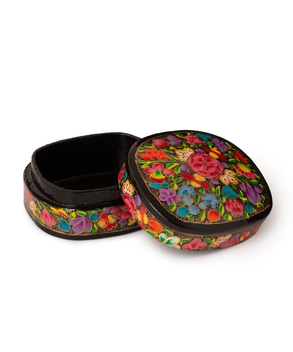 Celebrate art and craftsmanship with this exquisite hand-painted paper mache box, adorned with vibrant floral motifs. Crafted using traditional techniques, each box is lightweight yet sturdy, perfect for storing jewelry, trinkets, keepsakes, or as a decorative accent. The rich colors and detailed brushwork make it a timeless piece that brings a splash of culture and creativity into any space.