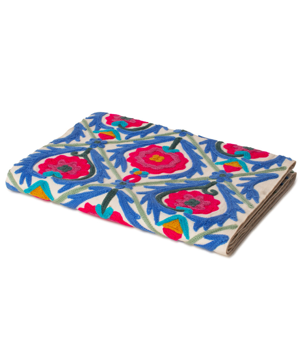 Bring vibrant artistry to your dining space with this handcrafted Suzani embroidered table runner, inspired by traditional Central Asian designs. Featuring vivid floral patterns stitched in rich hues of blue, red, and green, this runner adds a lively, cultural touch to any table setting. Made with care by skilled artisans, it’s perfect for special occasions or everyday decor to infuse color and character into your home.