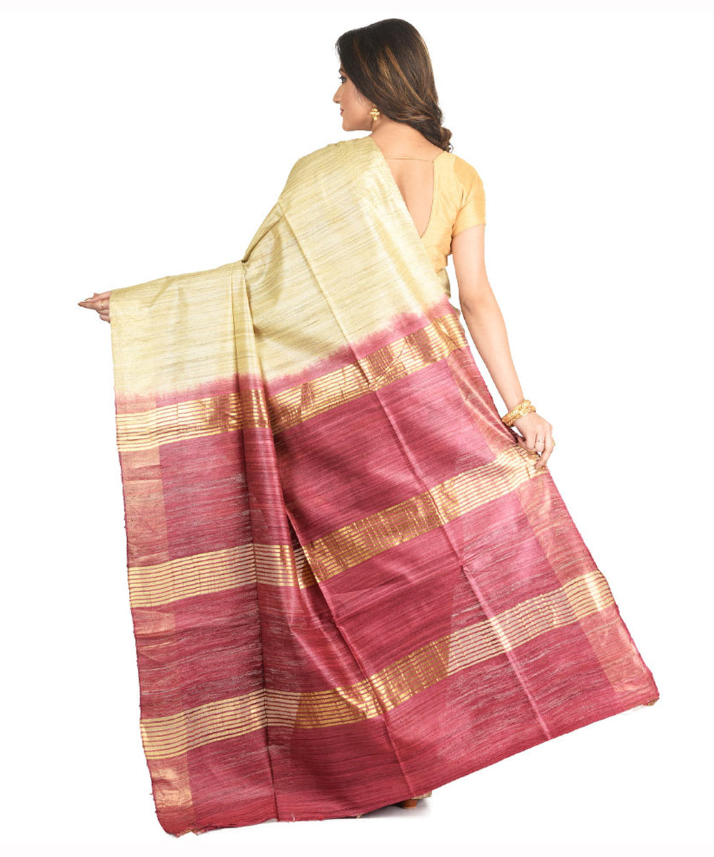 This hand woven designer tussar ghicha zori dye saree has been woven in a thread count of 18/20 denier tussar in warp way and hand spun ghicha tussar in weft way.