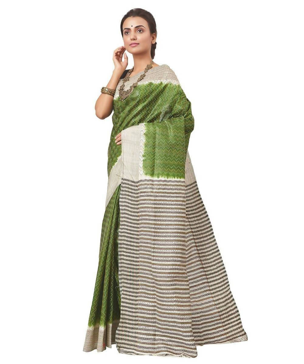 Biswa bangla handwoven green tussar silk saree with kantha jalchiri work
