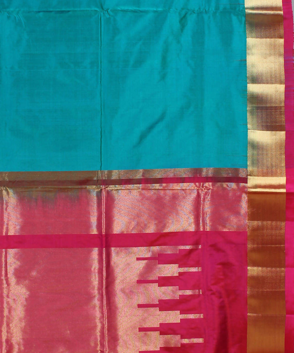 Beautiful blue cyan double shaded handloom khadi silk saree handwoven by the skilled artisans of Sri Nandi Khadi Gramodyoga Sangha (R.) at Khadi Nation, Karnataka. The blue saree body is highlighted with intricately designed decked up festive bull motifs woven towards the lower saree borders. Bright golden and pink stripe borders are woven at the edges. The saree pallu is highlighted with abstract temple patterns in pink and golden zari. The saree comes with an attached pink contrast blouse piece.