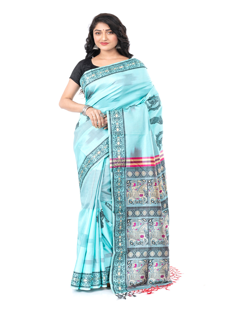 Cyan blue handwoven malda silk ikat border swarnachari baluchari saree