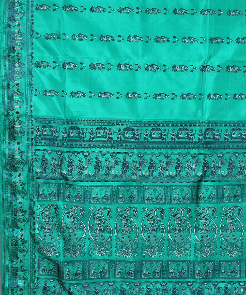 Mythology centric design motifs are what defines an authentic baluchari sari. Depicting iconic scenes from the epic stories of Ramayana and Mahabharata, each of these sarees is skillfully woven by the weavers of Bankura cluster at Madhabganj Baidyapara, West Bengal