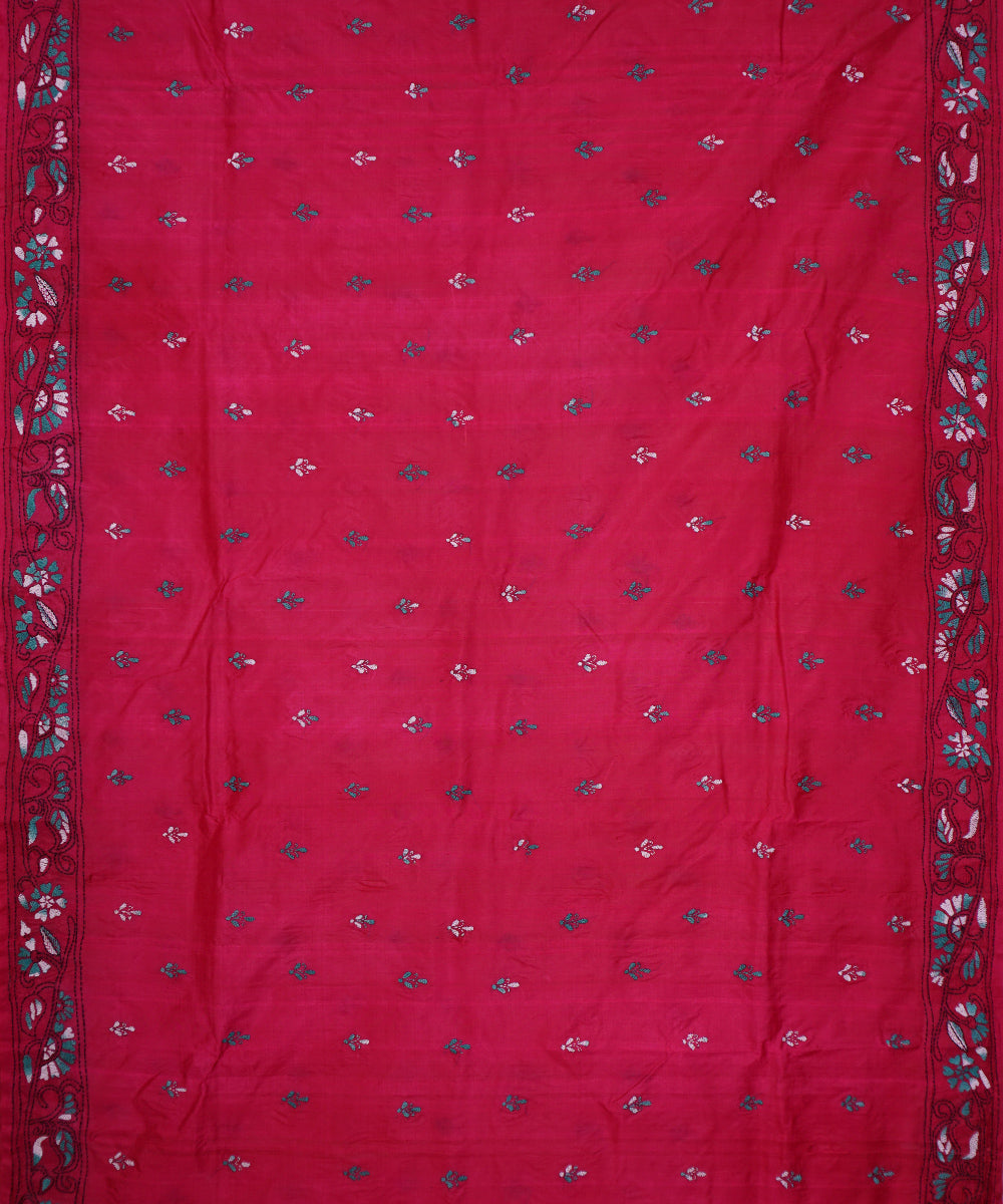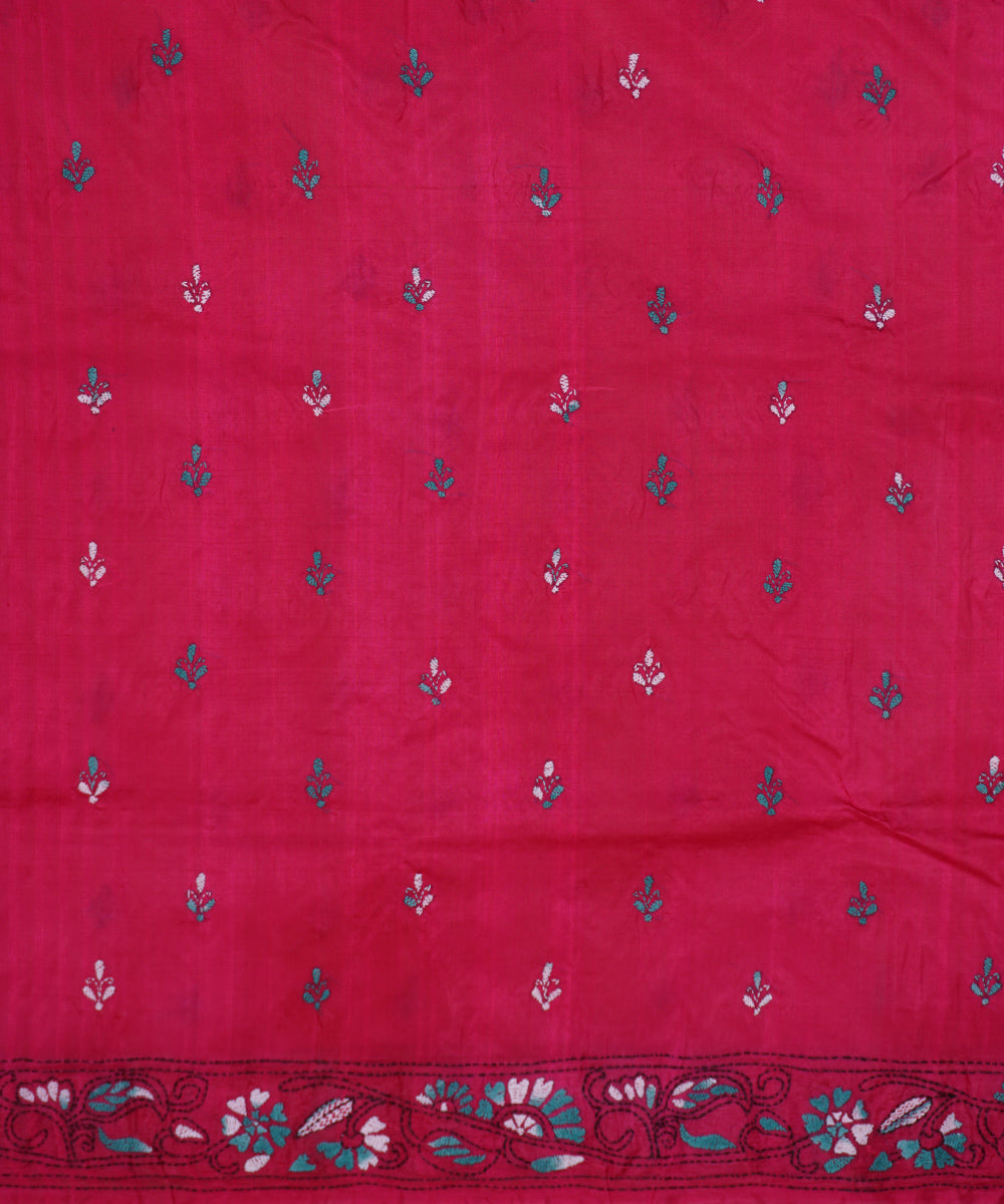 Deep pink tussar silk hand embroidery kantha stitch saree