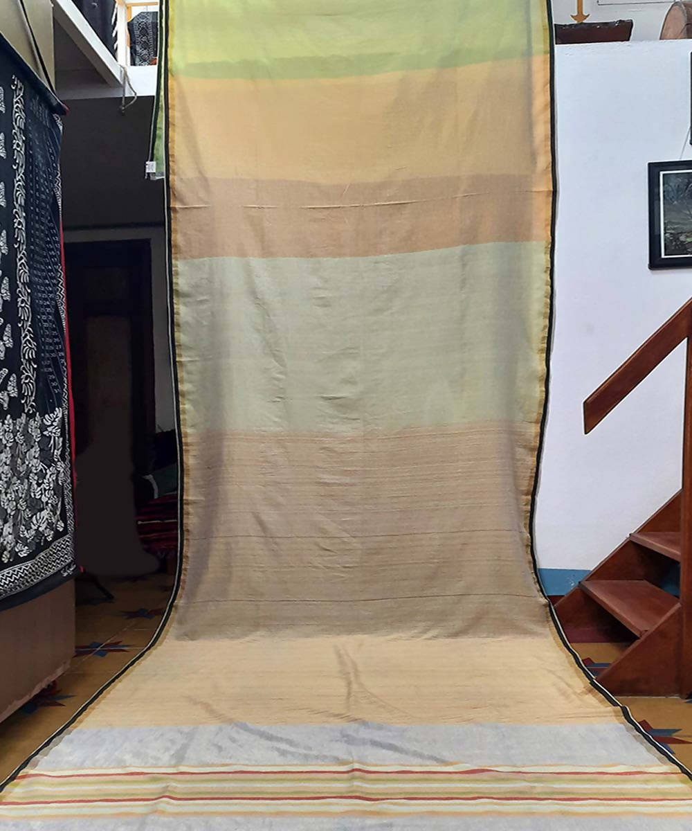 Muslin saree with variegated stripes in pallu and pastel colour blocking in body, an unique non repeat pattern woven in pastel shades of yellow and green, accentuated with dull gold in border and pallu. Weaving of this saree only possible in handloom.