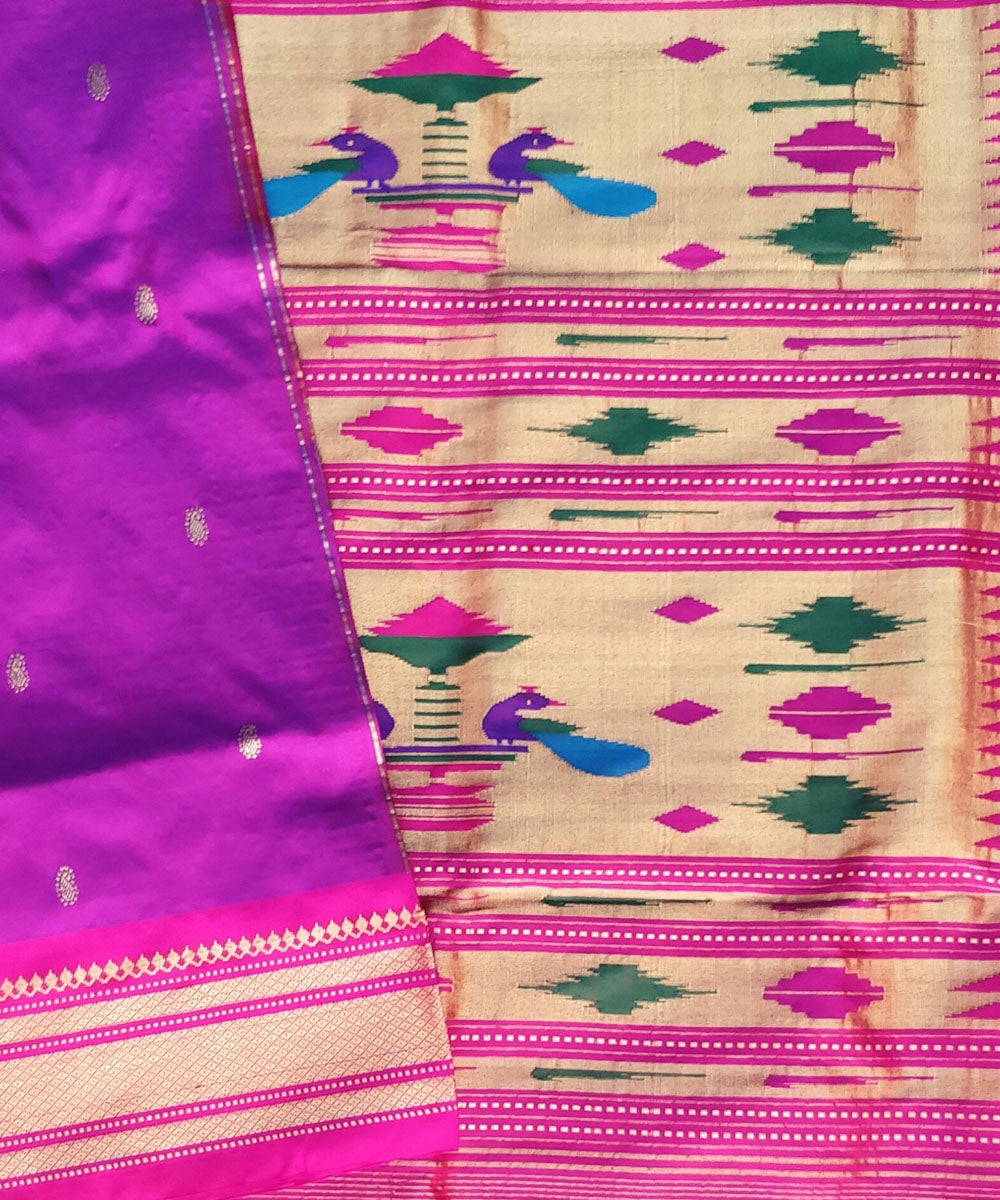 This appealing Magenta paithani designed with zari buttis all over the body of the saree and the motifs are woven in a way that gives the paithani it's traditional appeal. The 6 pairs of peacock on the pallu gives the paithani it's signature look. It is handloom with 100% pure silk and it comes with a matching blouse piece.
