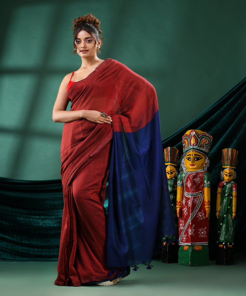 Maroon navy blue handloom bengal cotton saree