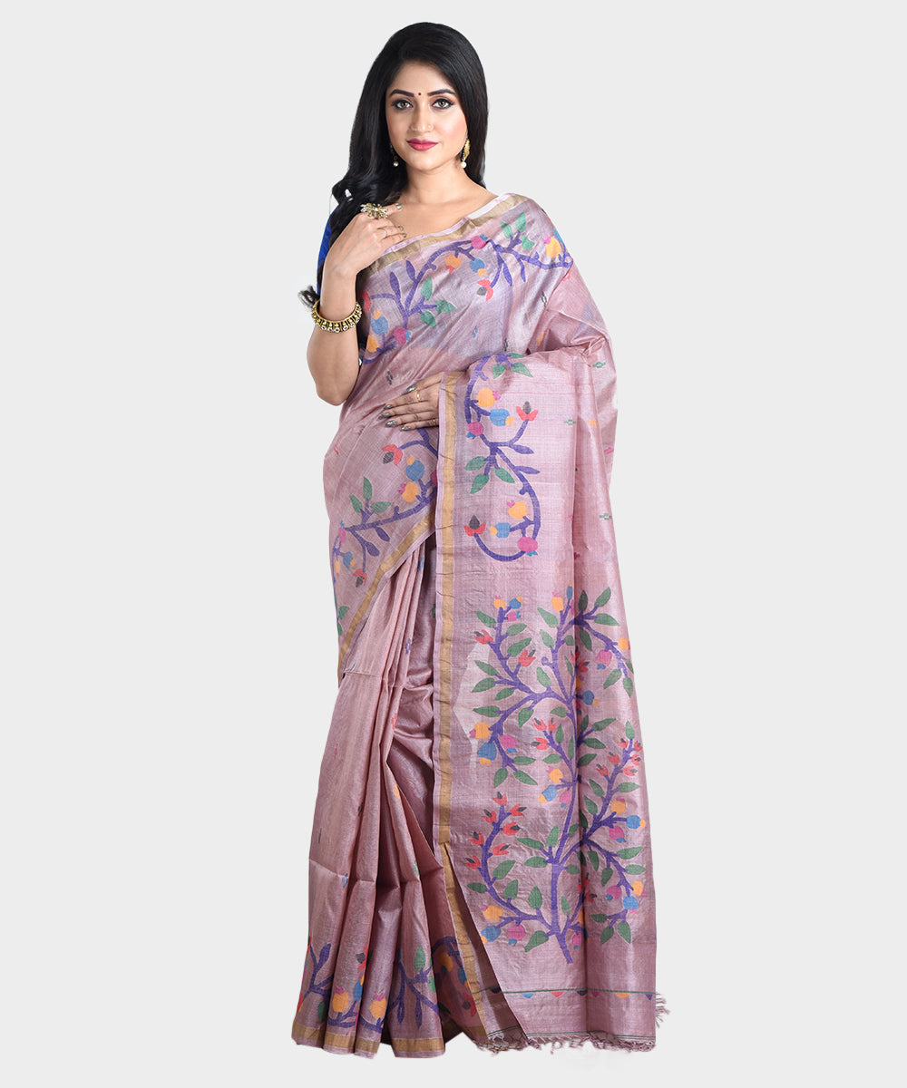 This Mulberry Silk Handwoven Designer Saree has been woven in hand spun tussar Silk in warp way and hand spun tussar Silk in weft way and then Handwork of Jamdani done on it.