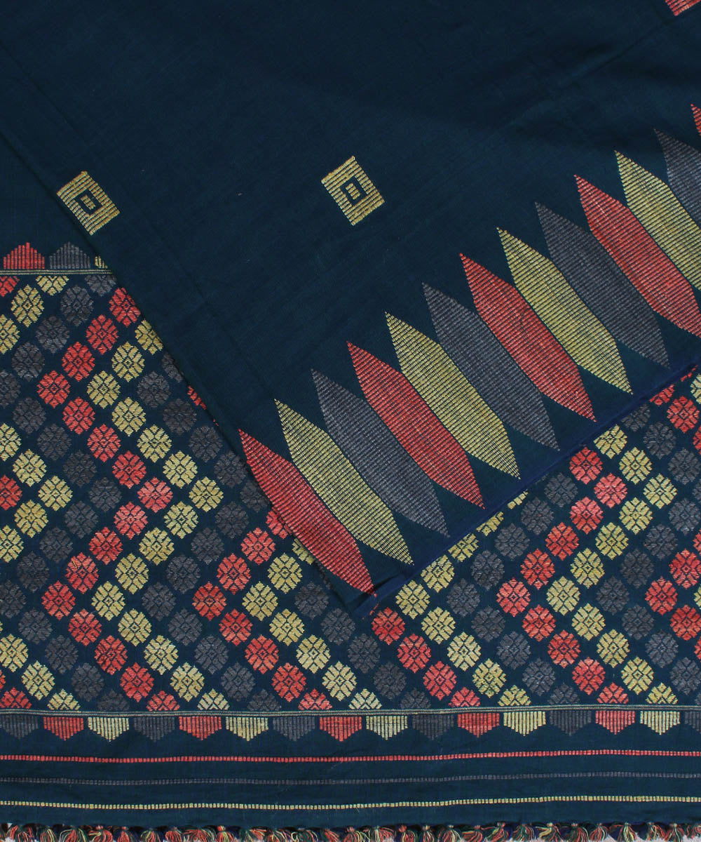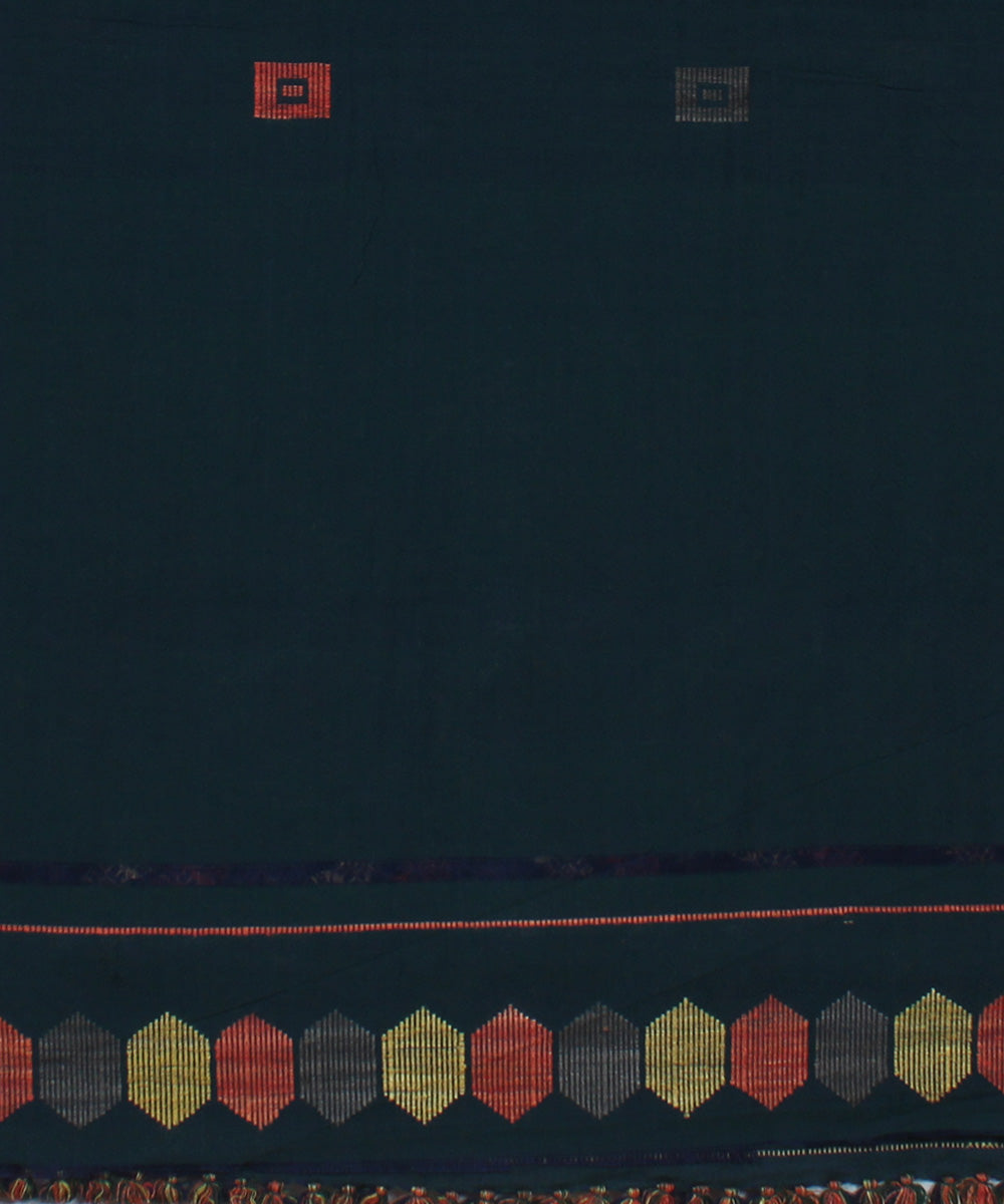 a sophisticated dark green grey shade cotton saree with intricate mishing handwoven designs in naturally dyed eri silk yarn motifs across the saree borders and pallu. The pallu end of the saree is neatly knotted in tassels.
