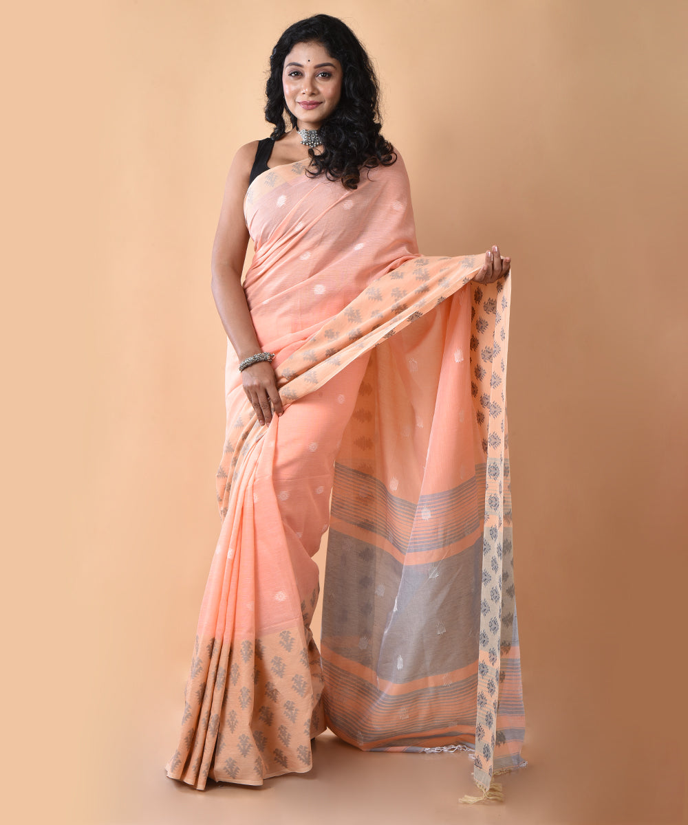 Peach handwoven jamdani cotton saree