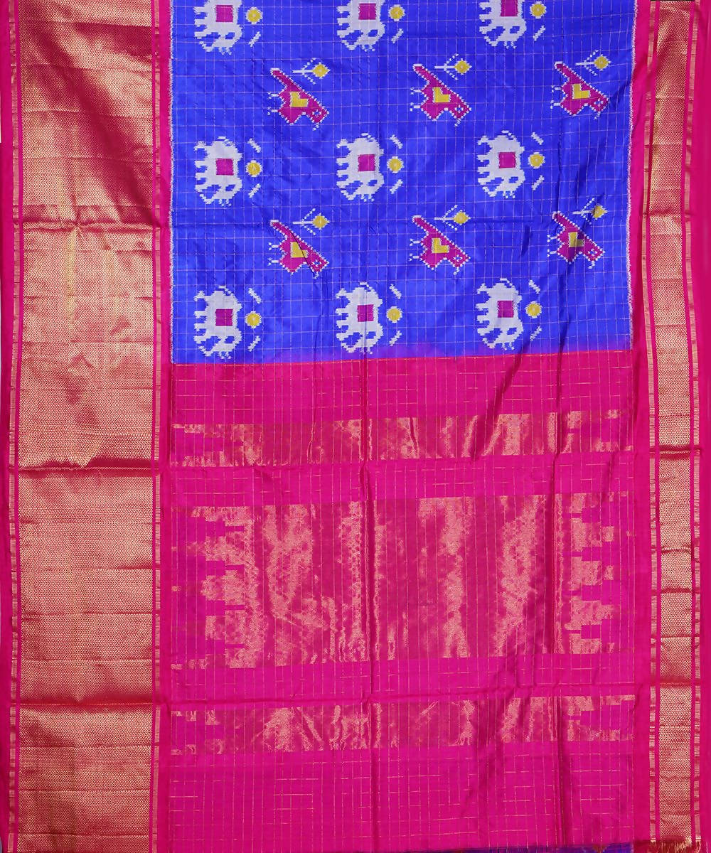 Elegant handwoven Ikat rajkot style pochampally silk saree by the weavers of Pochampally Weavers Co-operative Society from Pochampally in Nalgonda district, Telangana state. This gorgeous saree is woven in a royal blue and pink combination. The royal blue saree body is highlighted with white elephants and pink bird motifs. Golden zari tissue and pink silk yarn borders are woven in the saree edges as broad stripe in the lower edge and narrow stripe in the upper end. The pallu is traditionally woven with thin golden zari tissue in pink base with golden zari stripes. This saree holds the prestigious tag of Handloom Mark of India which certifies the authenticity and genuinely of this handwoven product. The Pochampally Ikat weaving technique is one of most complex tie-dye technique. The weavers at Pochampally have mastered this art over centuries.