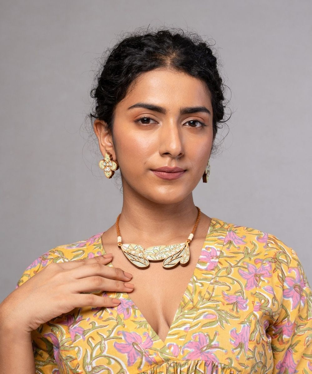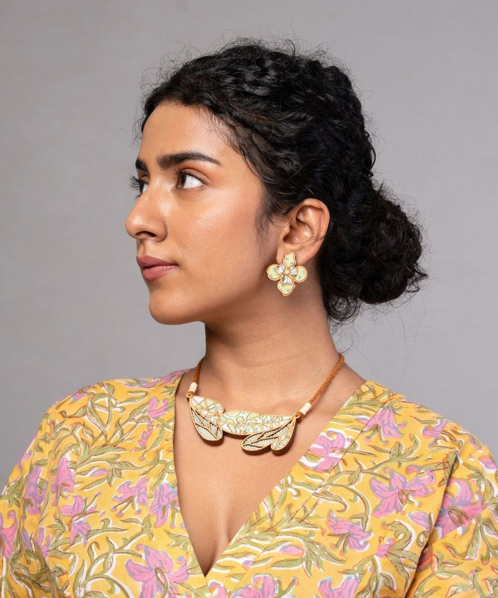 Green bloom handmade leaf motif repurposed fabric wood necklace