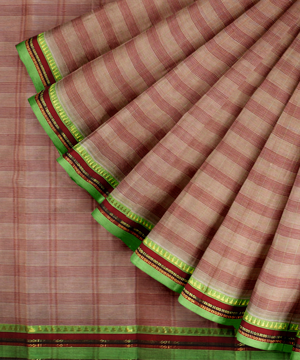 The Narayanpet sarees define comfort in simplicity through its handloom weaves. This GI tagged craft variety is woven at the clusters of Narayanpete in Andhra Pradesh. With a strong influence from the Maratha empire which started this tradition back in 1630, the identifying features for the saree are the simple striped borders and pallu with variations in the checks of the saree body. Choose to drape a narayanapete saree in cotton for formal work and silk sarees for festive celebrations.
