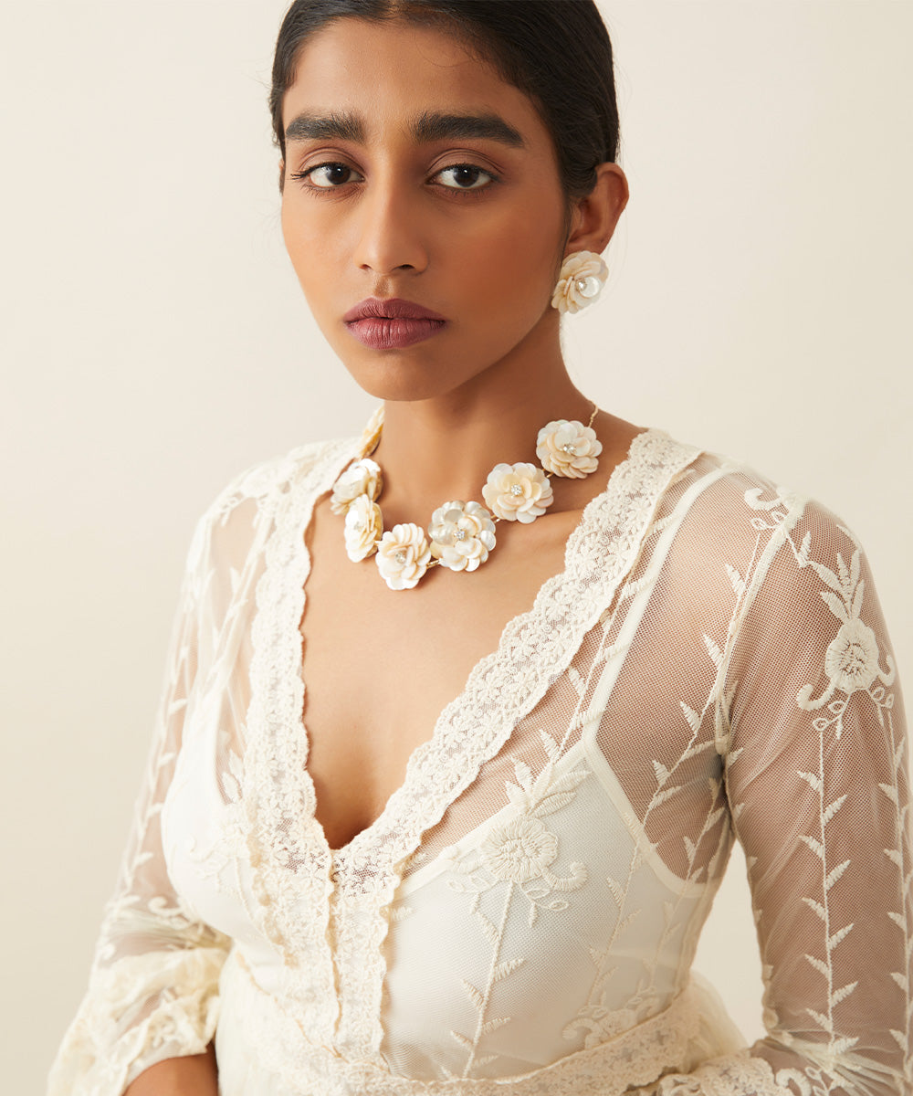 This product is made using handmade Mother of pearl in the design of flowers. Mother of pearl, is an organic–inorganic composite material produced by some molluscs as an inner shell layer; it is also the material of which pearls are composed. The necklace is modern festive and perfect for gowns.