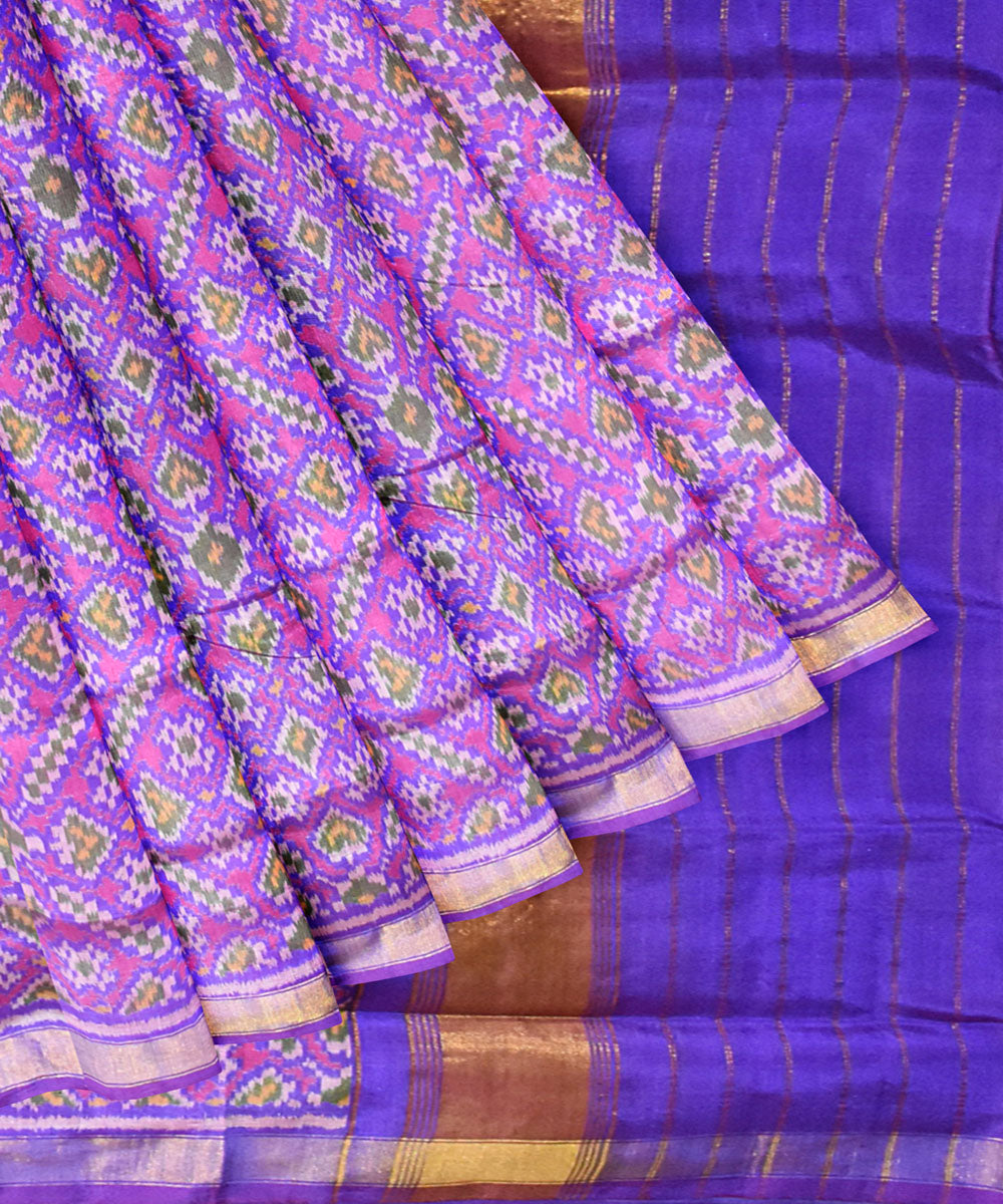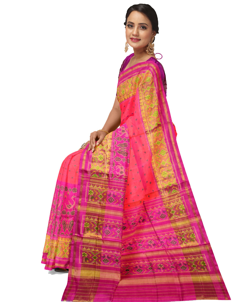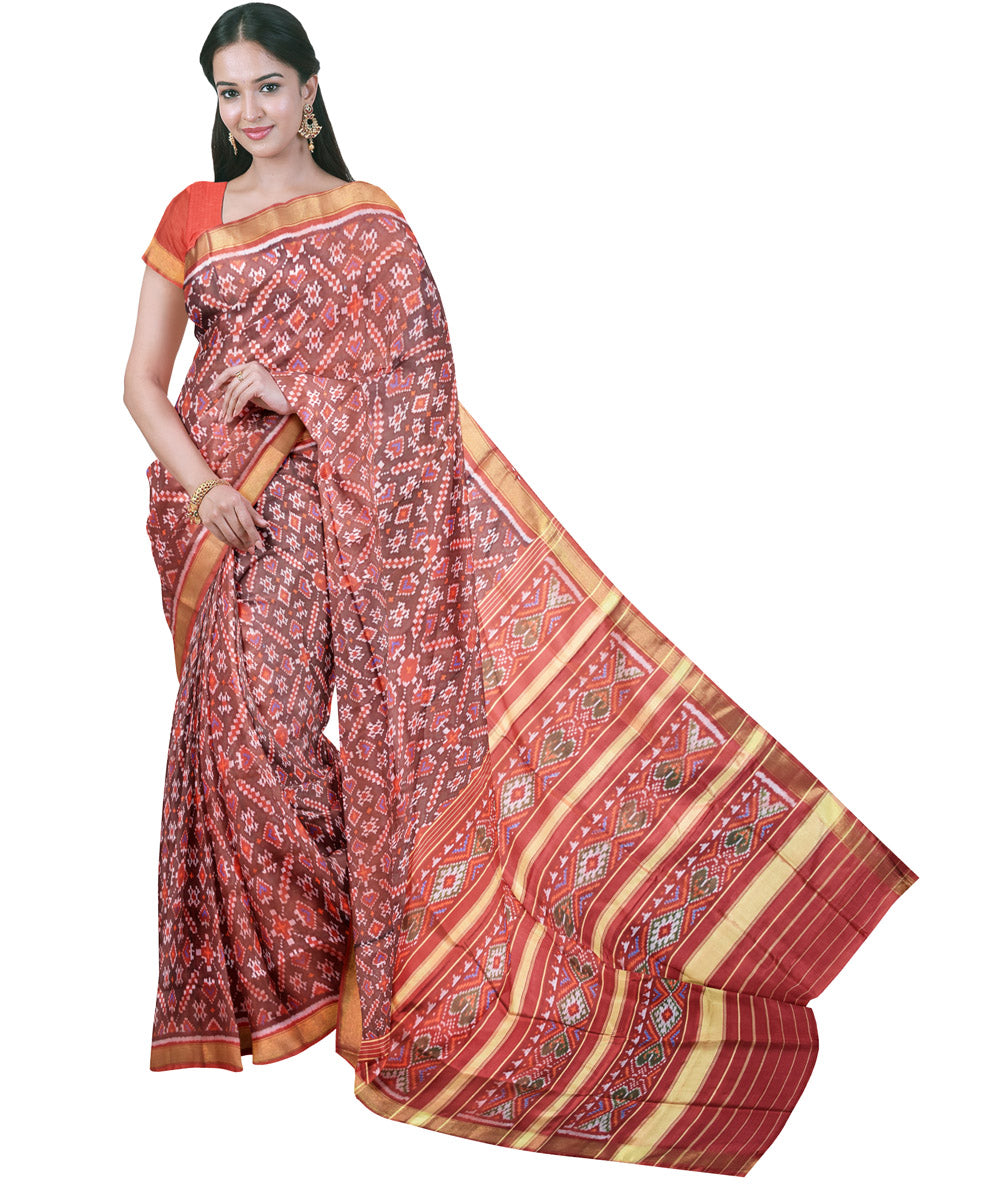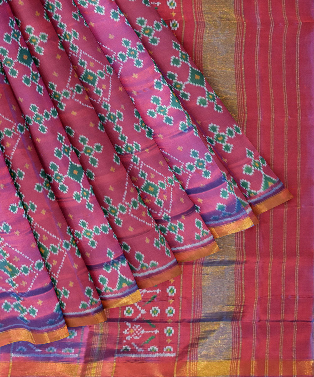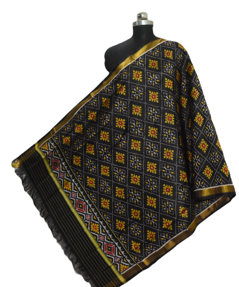 Sanskruti Silks is of Pankaj Makwana , a national award master weaver of the famous double ikkat patola from Gujarat and specialises in sarees and dupattas. Patola is a tie and dye technique of dyeing and weaving similar to Pochampally and Sambalpur Ikkat and usually comes in silk. The border and pallu come with zari and the body is entirely woven in a geometrical pattern. Patola is usually expensive because of the fabric and also the dyeing and weaving process which is intricate and time consuming.The patterns and designs of patola are very distinct. The motifs used are usually traditional flowers, elephants, birds and dancing figures and come in bright colours.