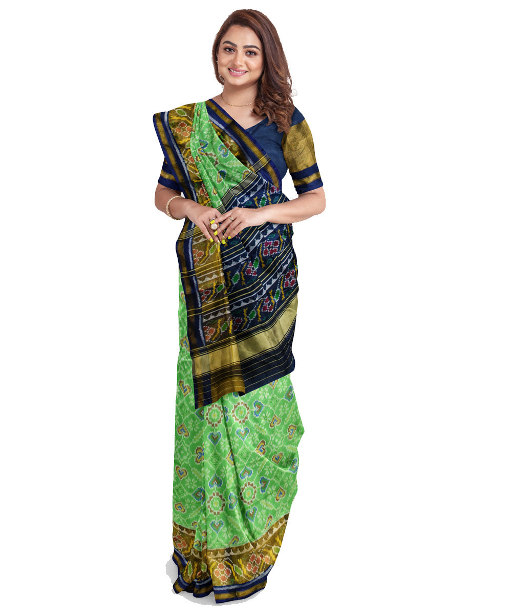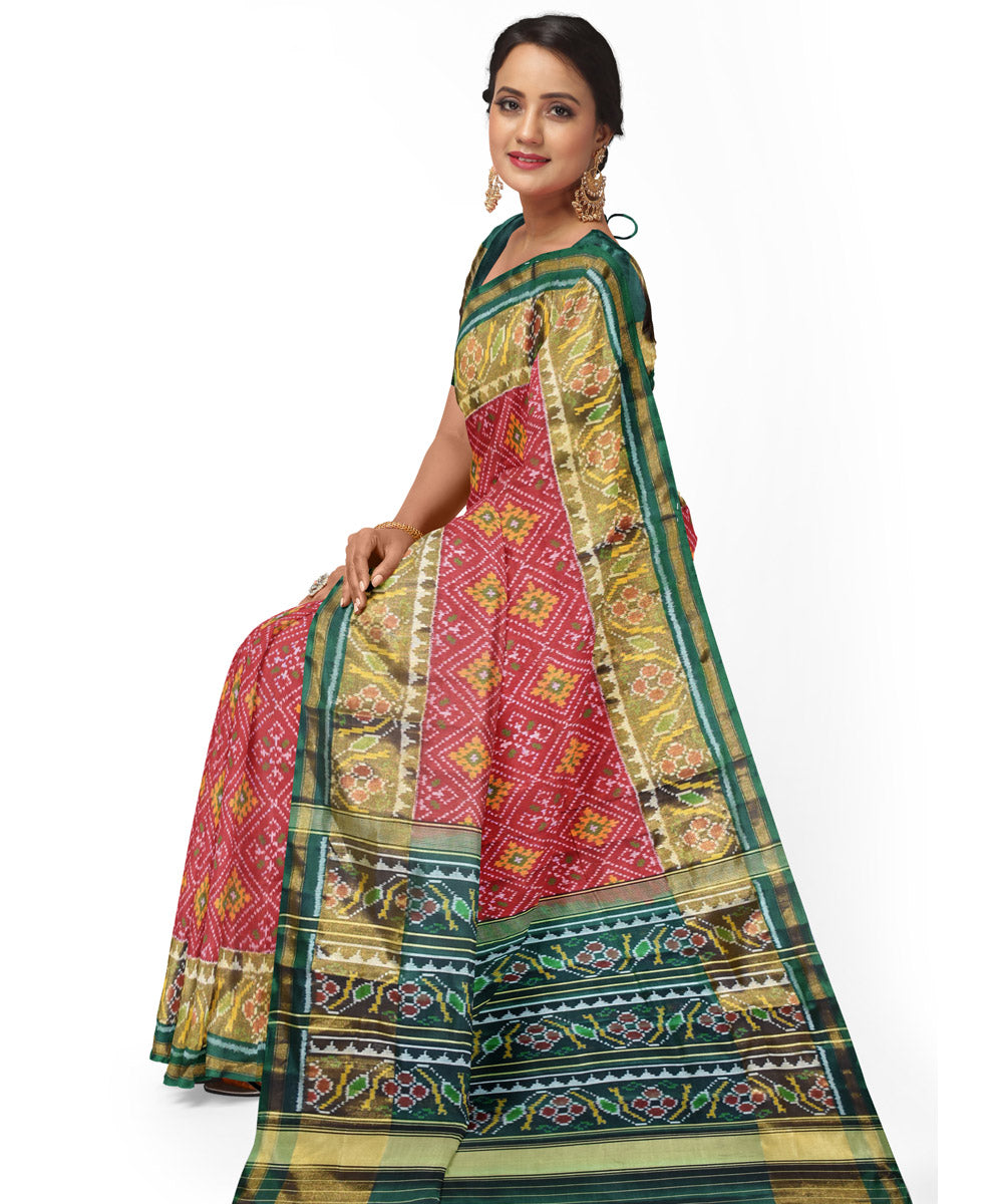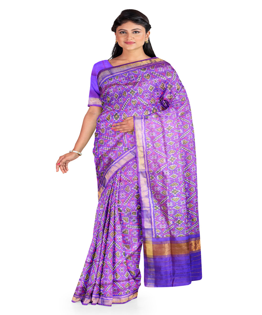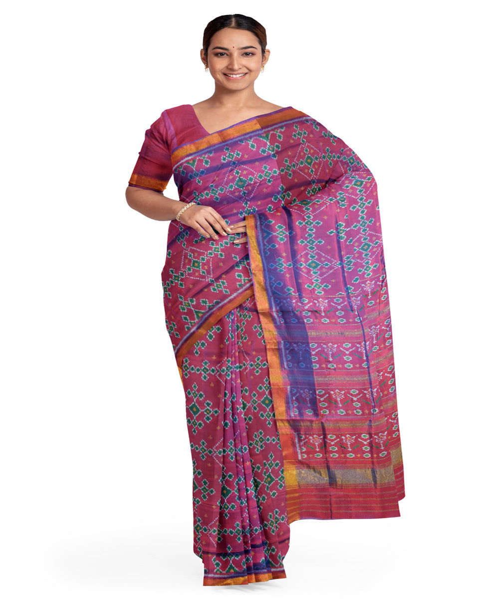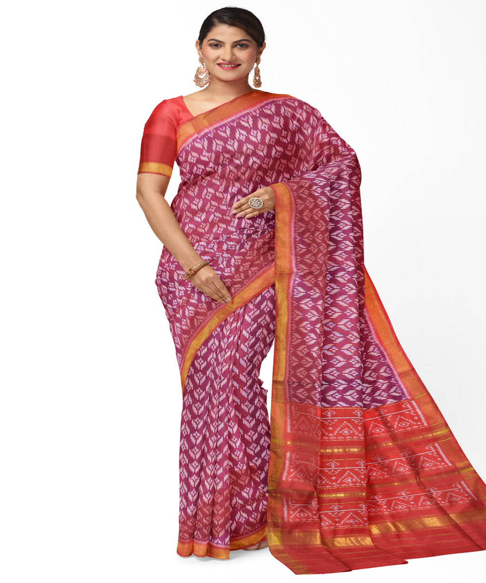 Sanskruti Silks is of Pankaj Makwana , a national award master weaver of the famous double ikkat patola from Gujarat and specialises in sarees and dupattas. Patola is a tie and dye technique of dyeing and weaving similar to Pochampally and Sambalpur Ikkat and usually comes in silk. The border and pallu come with zari and the body is entirely woven in a geometrical pattern. Patola is usually expensive because of the fabric and also the dyeing and weaving process which is intricate and time consuming.The patterns and designs of patola are very distinct. The motifs used are usually traditional flowers, elephants, birds and dancing figures and come in bright colours.