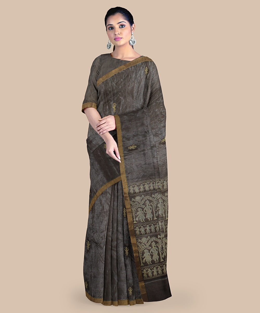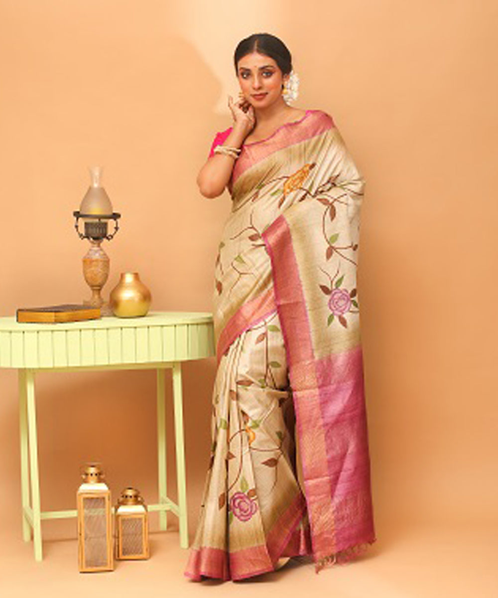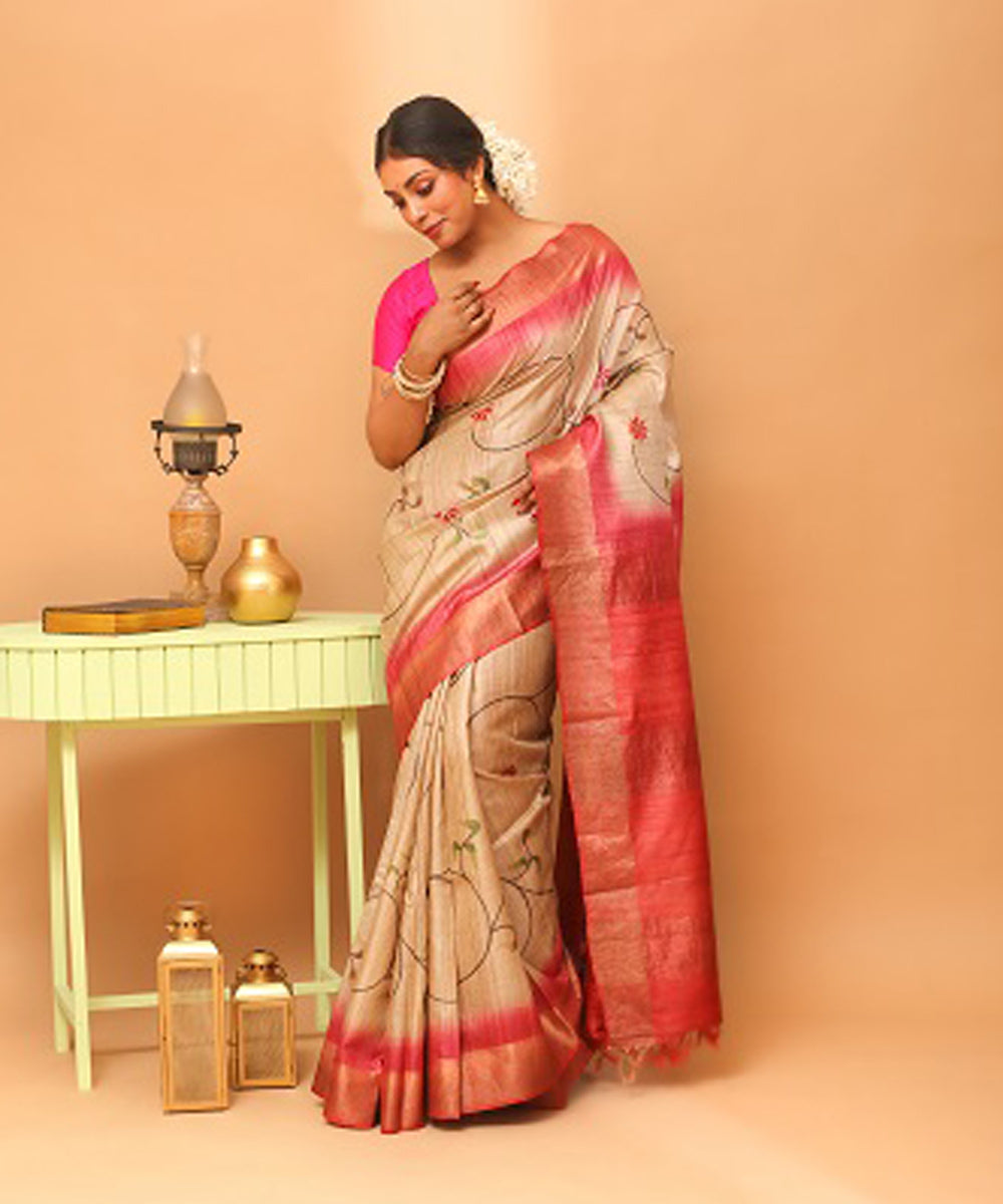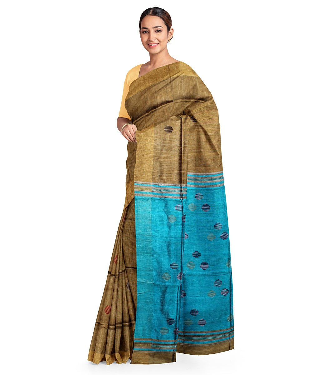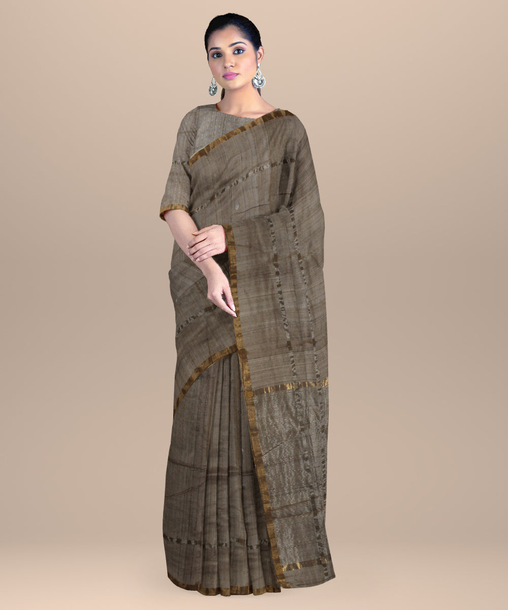 A collection of all handwoven tussar silk sarees featuring plain workwear sarees, printed casual wear sarees and also grand embroidery embellished saree varieties. Explore the textured finish of tussar silk yarns from the north and eastern craft clusters of India.