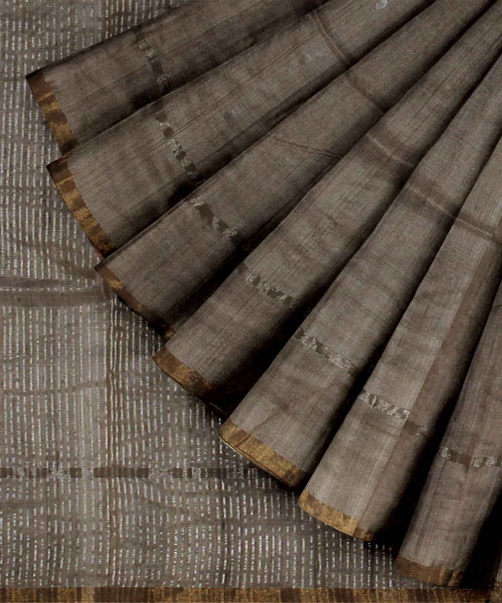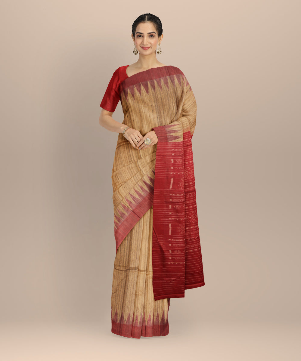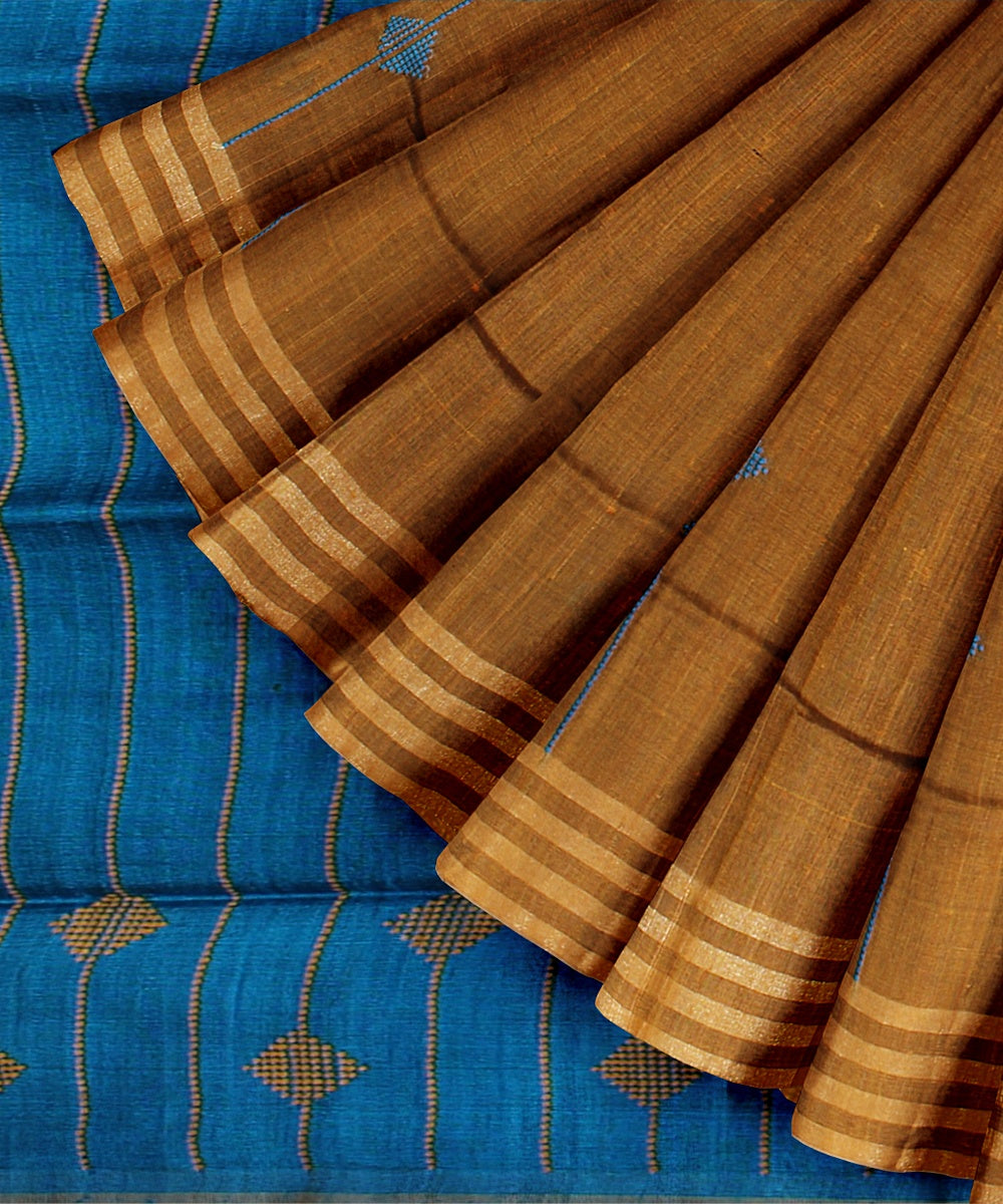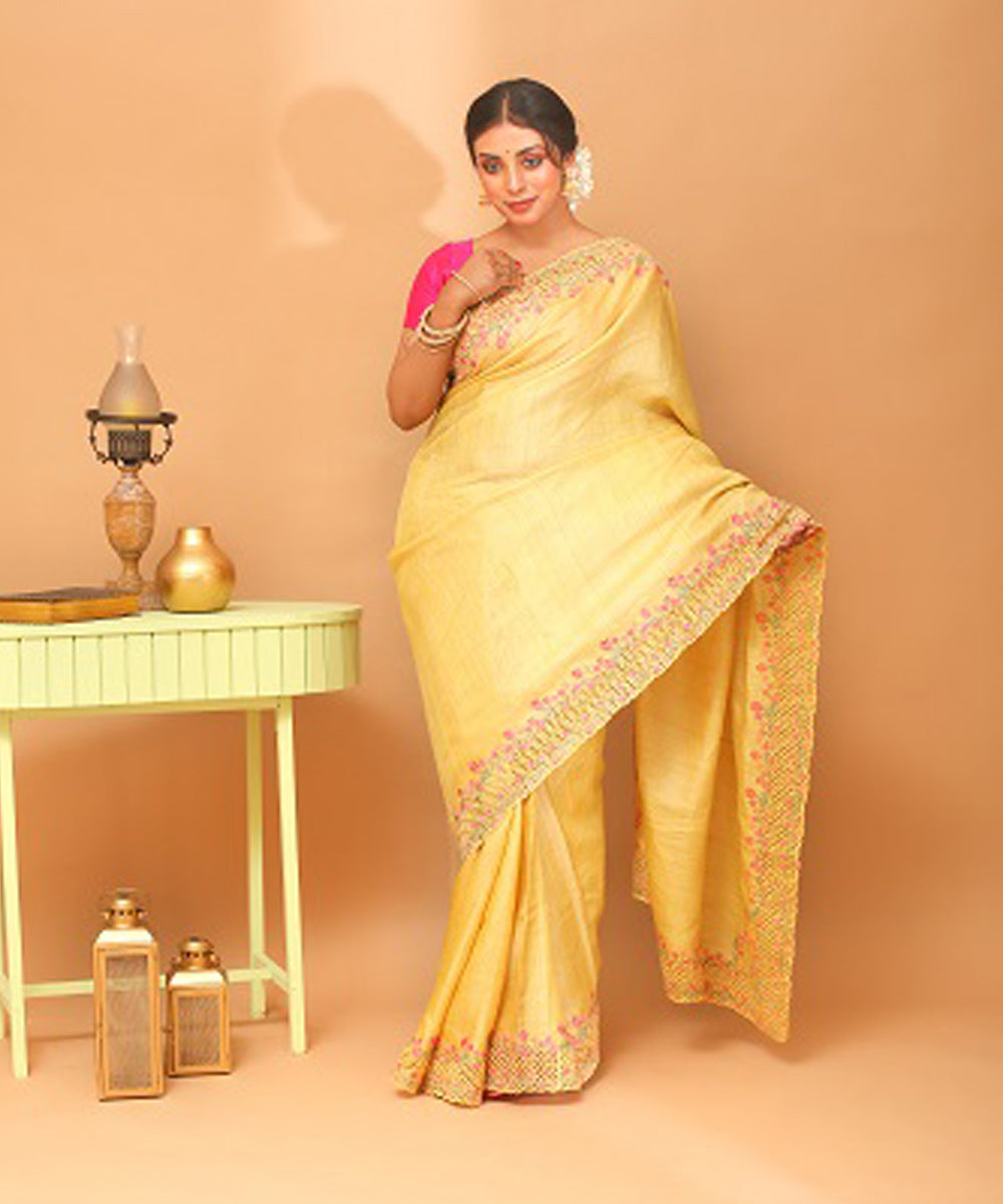 A collection of all handwoven tussar silk sarees featuring plain workwear sarees, printed casual wear sarees and also grand embroidery embellished saree varieties. Explore the textured finish of tussar silk yarns from the north and eastern craft clusters of India.