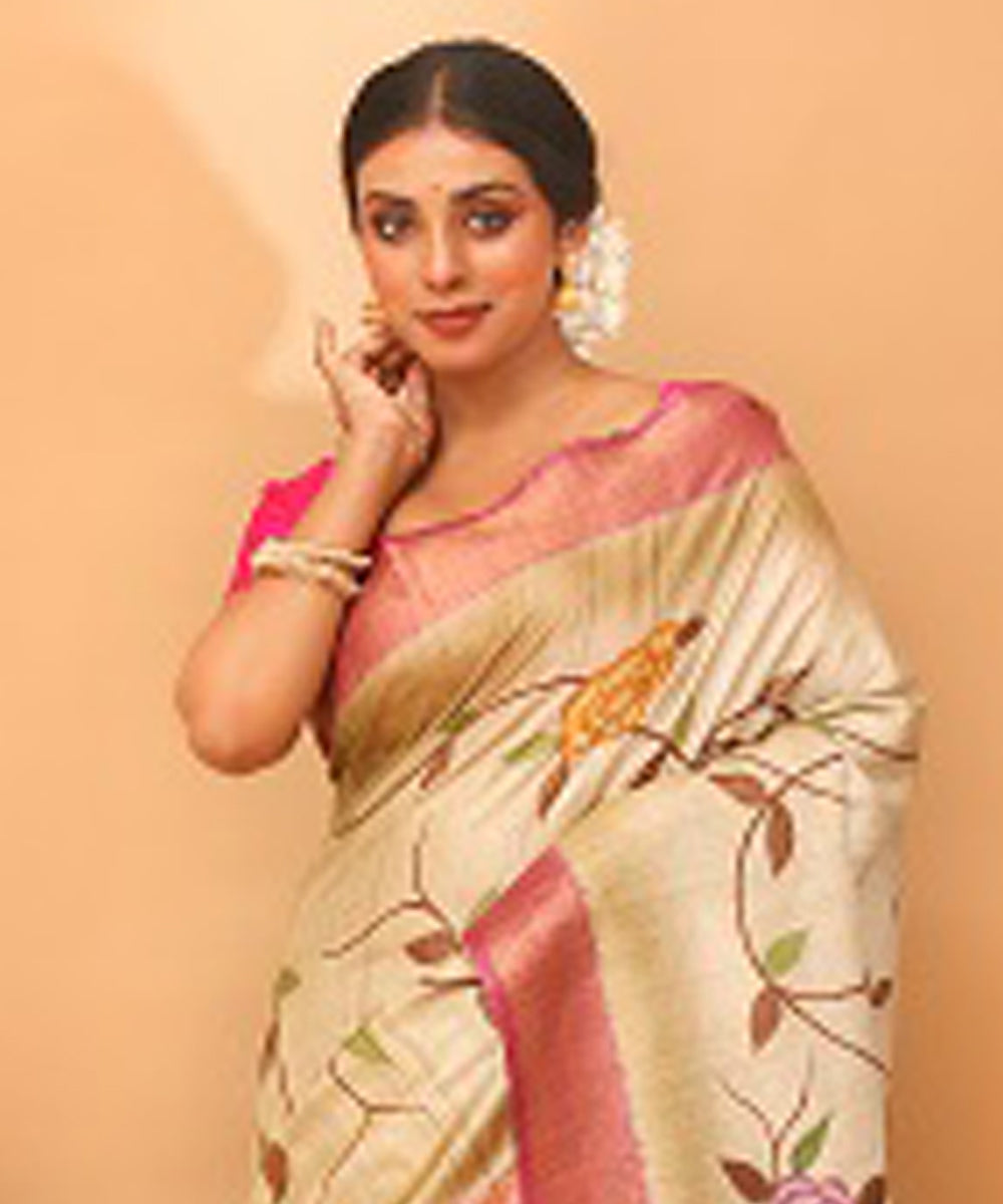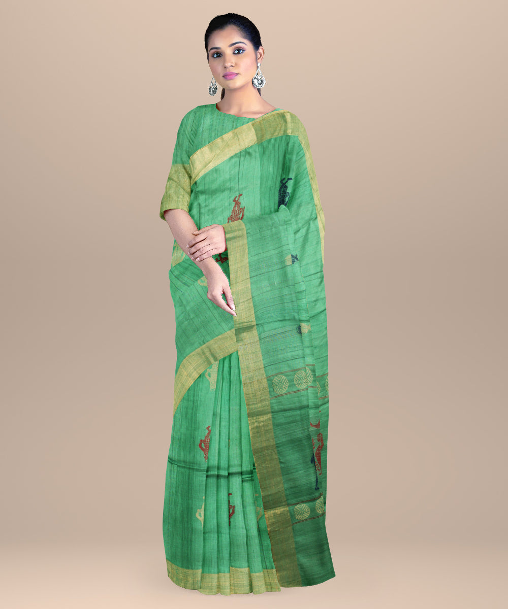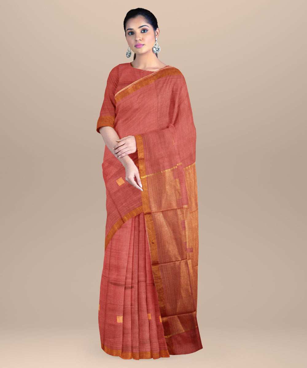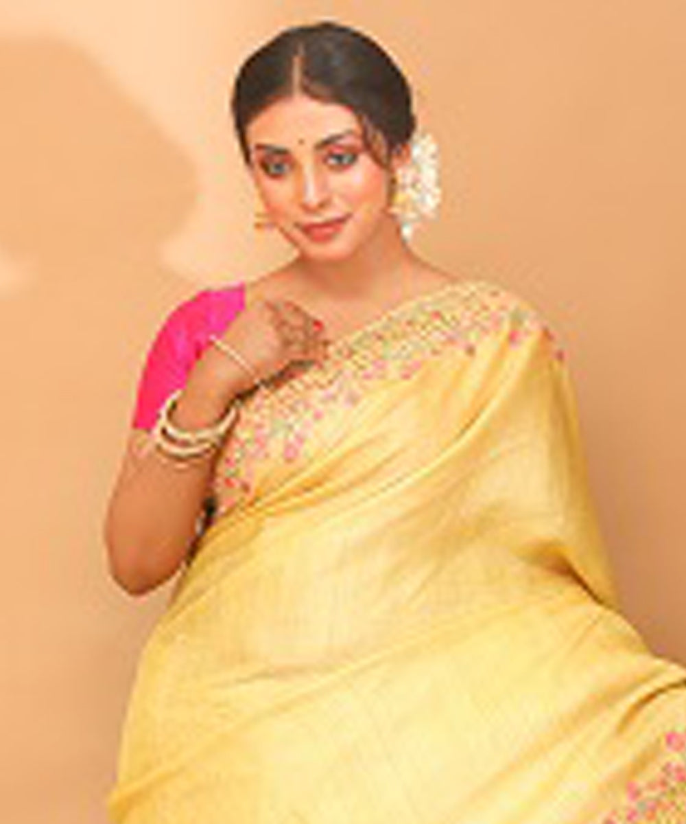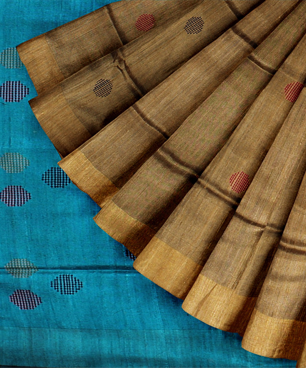 A collection of all handwoven tussar silk sarees featuring plain workwear sarees, printed casual wear sarees and also grand embroidery embellished saree varieties. Explore the textured finish of tussar silk yarns from the north and eastern craft clusters of India.