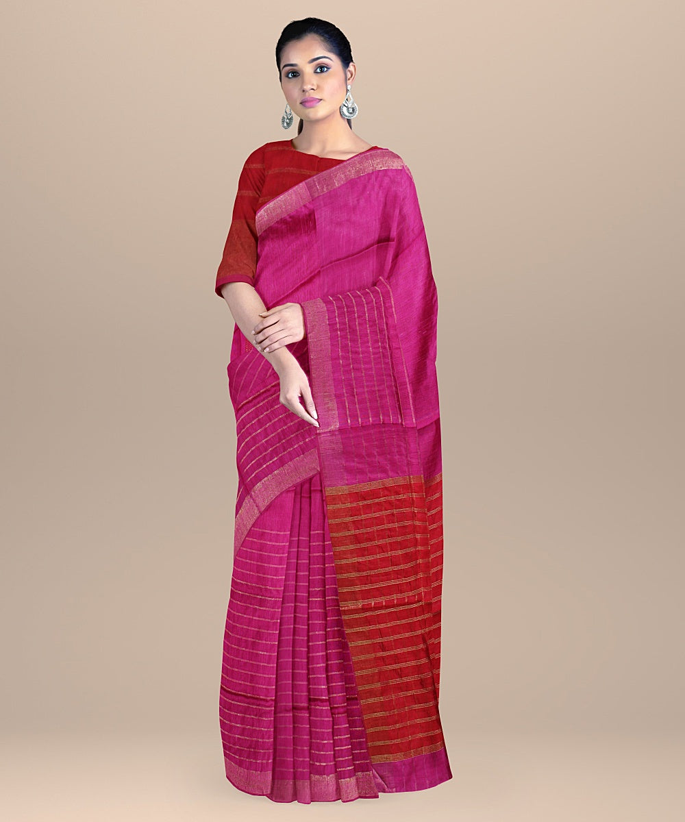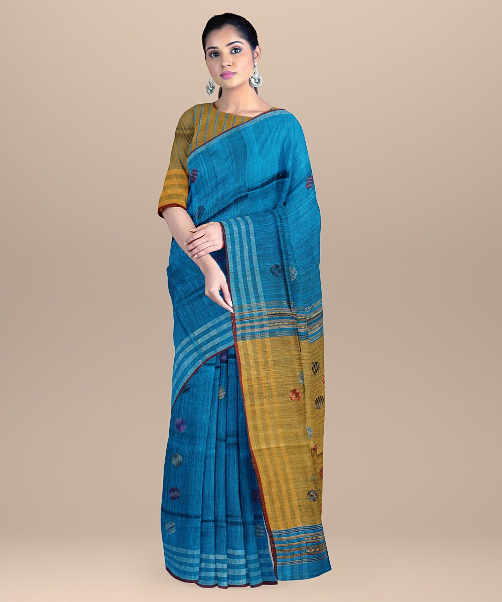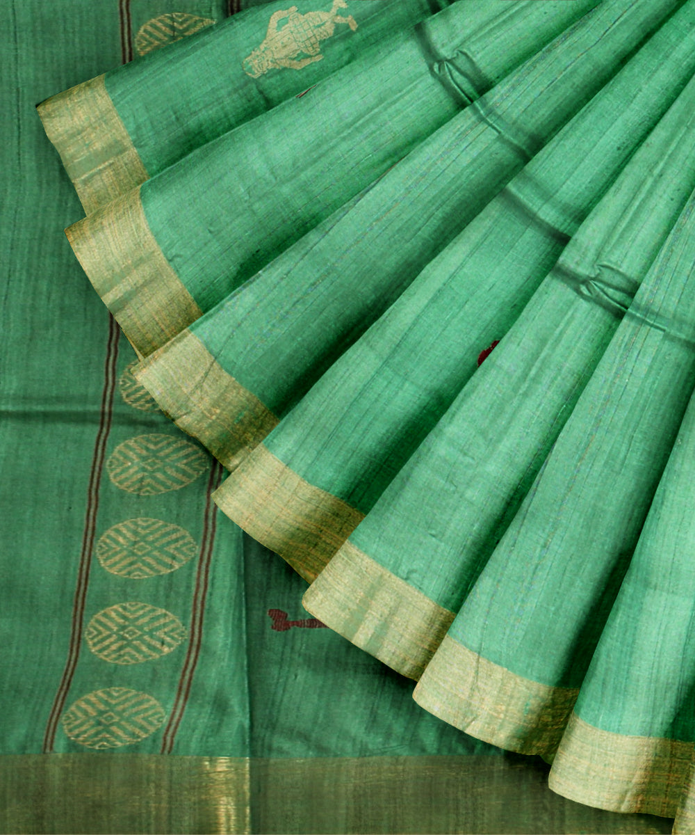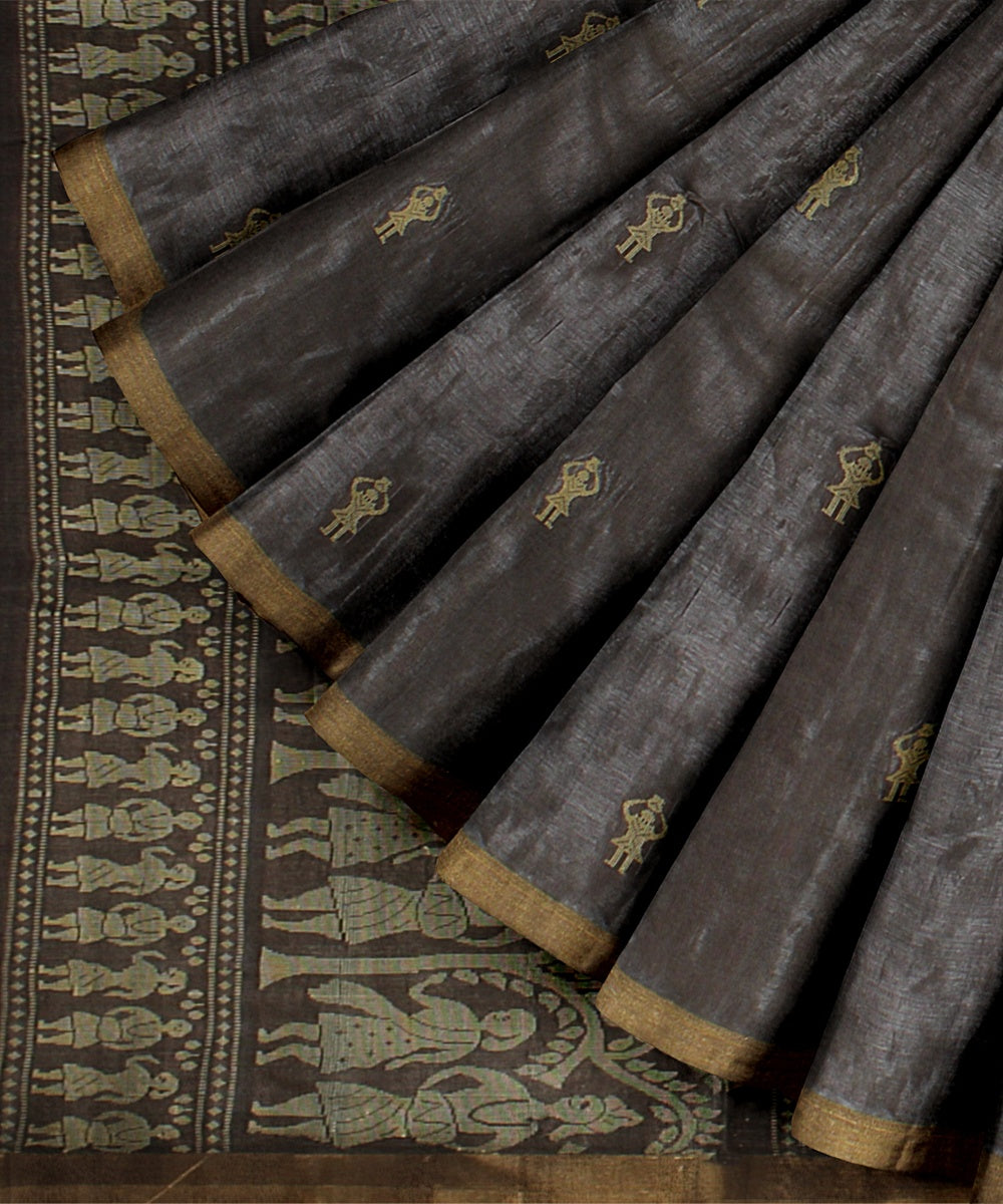 A collection of all handwoven tussar silk sarees featuring plain workwear sarees, printed casual wear sarees and also grand embroidery embellished saree varieties. Explore the textured finish of tussar silk yarns from the north and eastern craft clusters of India.