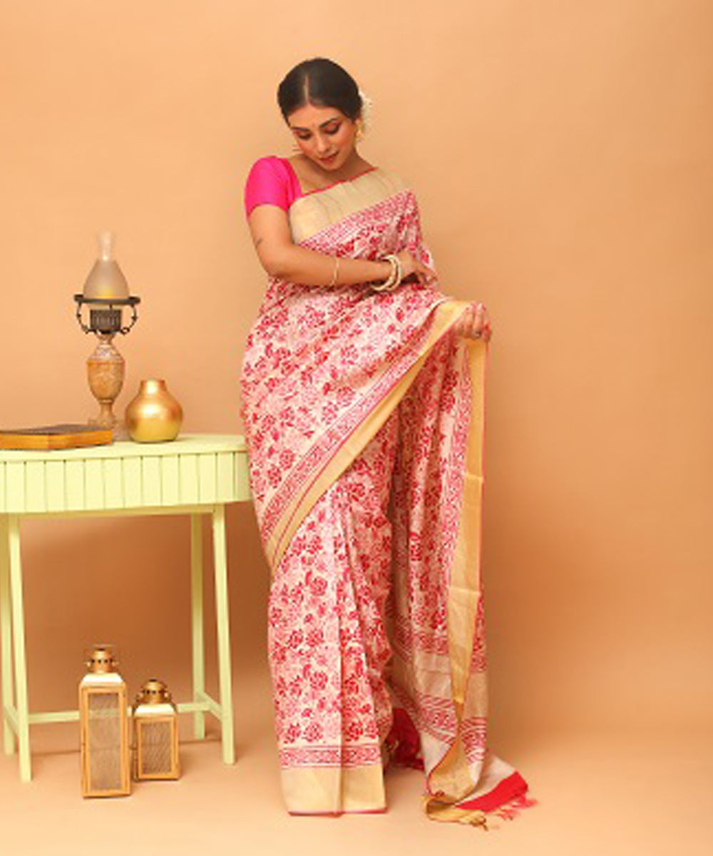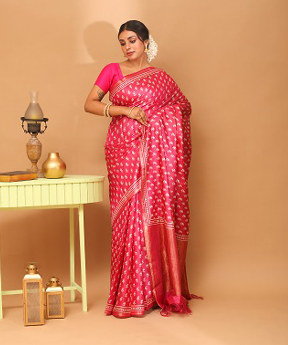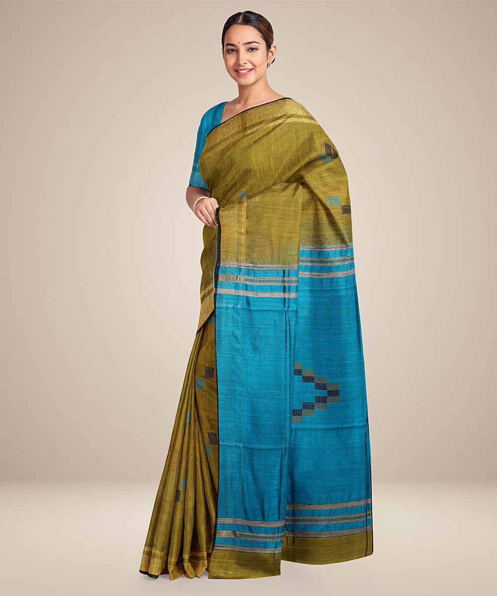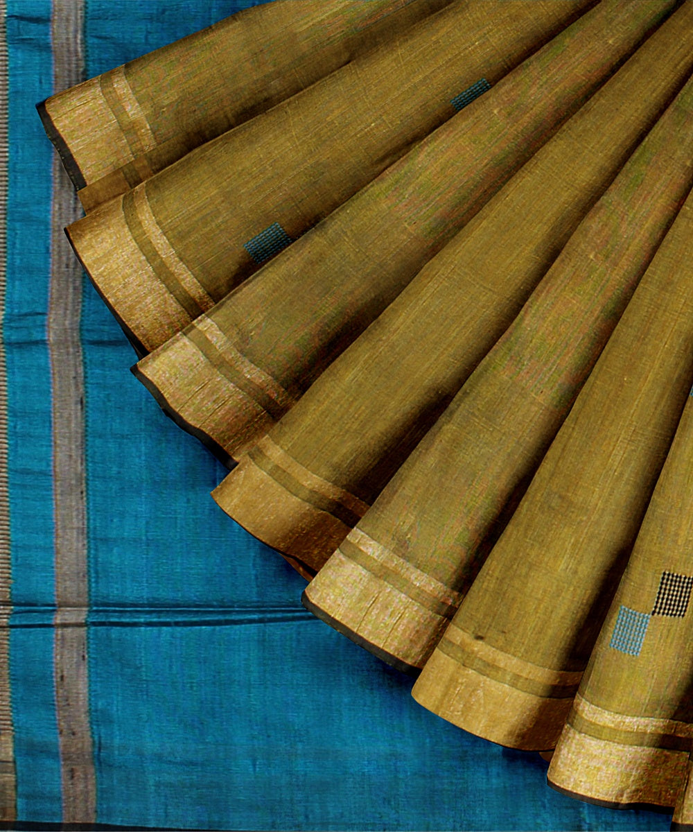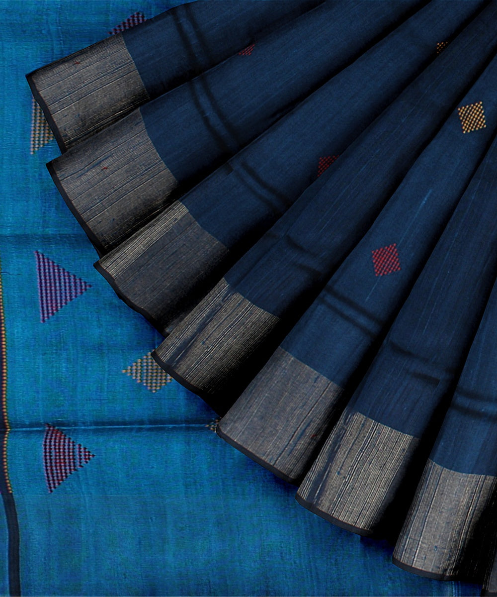 A collection of all handwoven tussar silk sarees featuring plain workwear sarees, printed casual wear sarees and also grand embroidery embellished saree varieties. Explore the textured finish of tussar silk yarns from the north and eastern craft clusters of India.