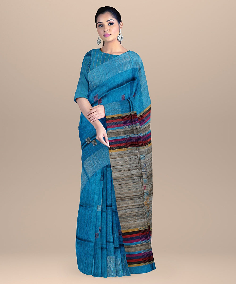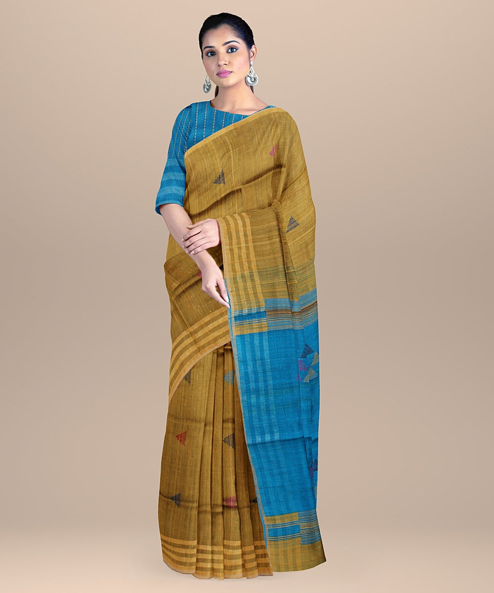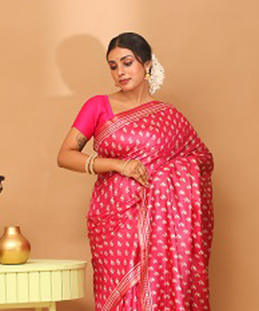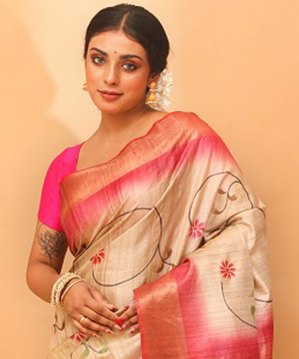 A collection of all handwoven tussar silk sarees featuring plain workwear sarees, printed casual wear sarees and also grand embroidery embellished saree varieties. Explore the textured finish of tussar silk yarns from the north and eastern craft clusters of India.