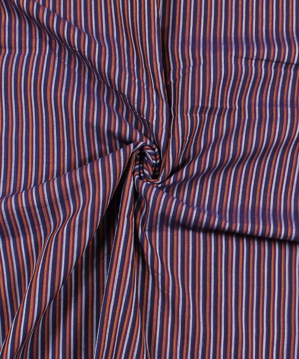handwoven purple and mustard striped cotton fabric from the looms of andhra pradesh. purple, mustard and white cotton yarns are alternately placed to form thin stripes throughout the fabric, making it suitable for lightweight garments. get creative and design comfortable outfits from this fabric to feel good.